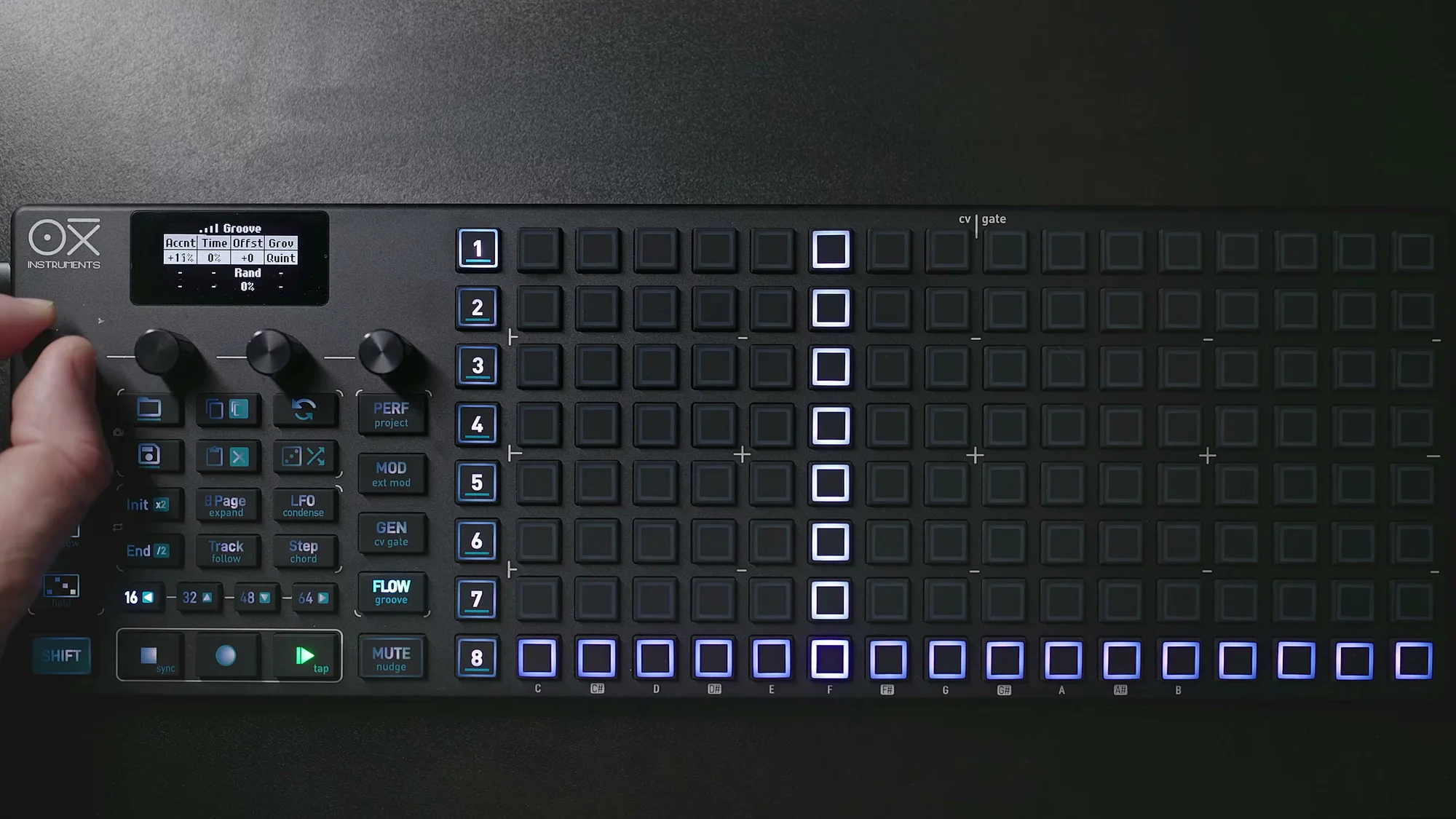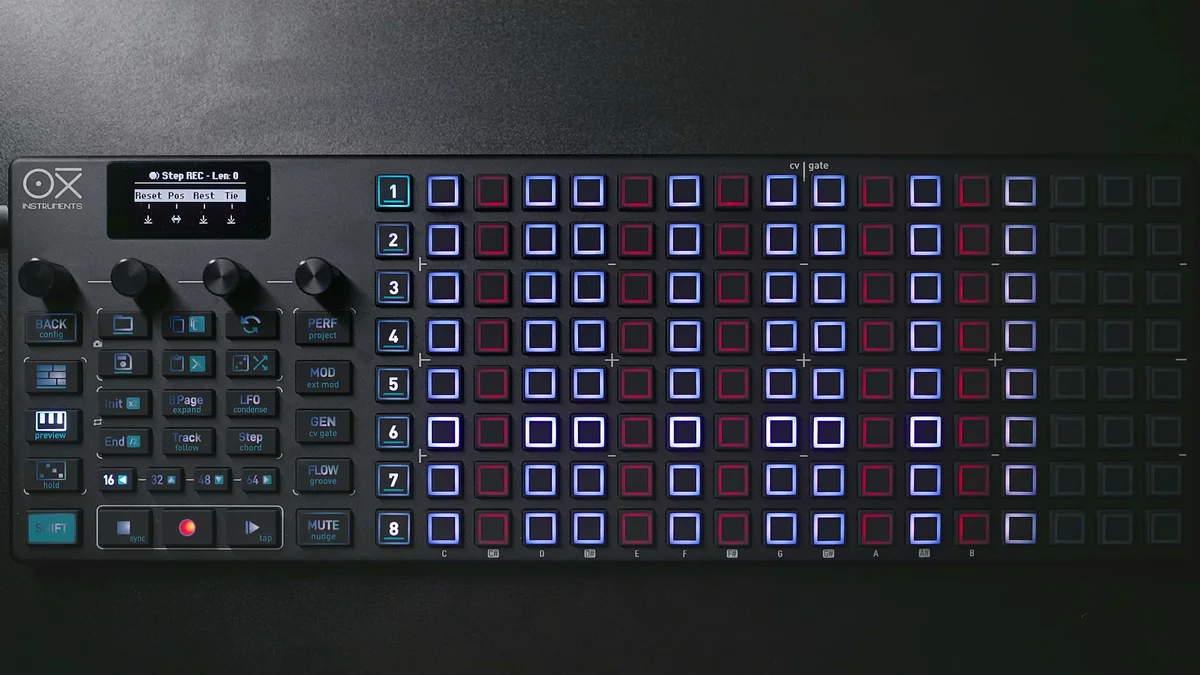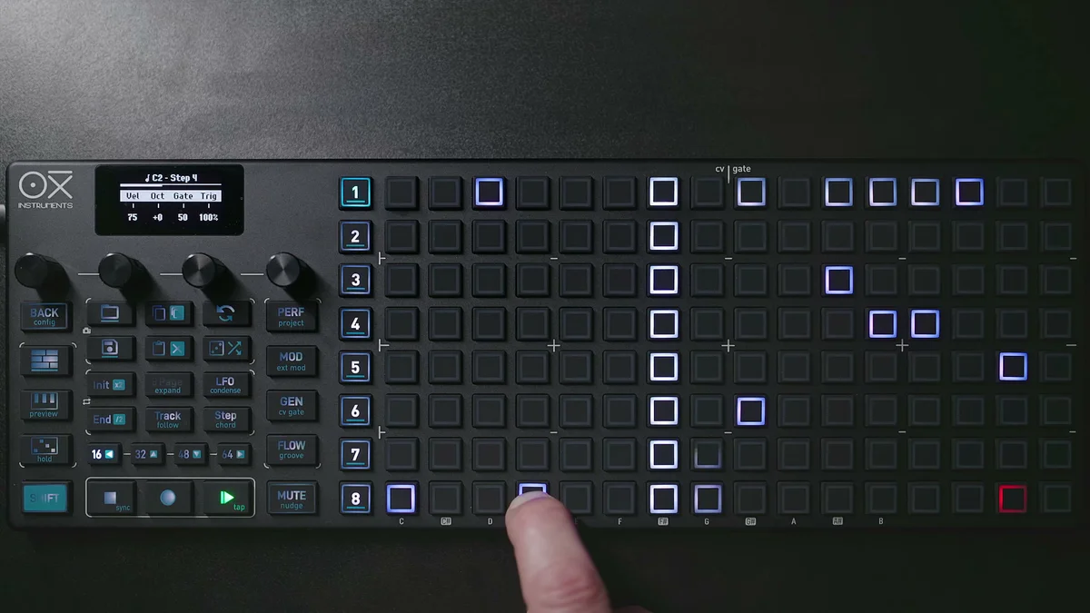 DAWのピアノロールエディターを使ったことがある人なら、見た目が似ているのですぐにイメージできるかと思います。ただしDAWと違って、OXI ONE MKIIのgridは8行×16列のパッドなので、同時に見える範囲は限られています。この制約の中で工夫するのも、ハードウェアシーケンサーならではの楽しさかなと。
