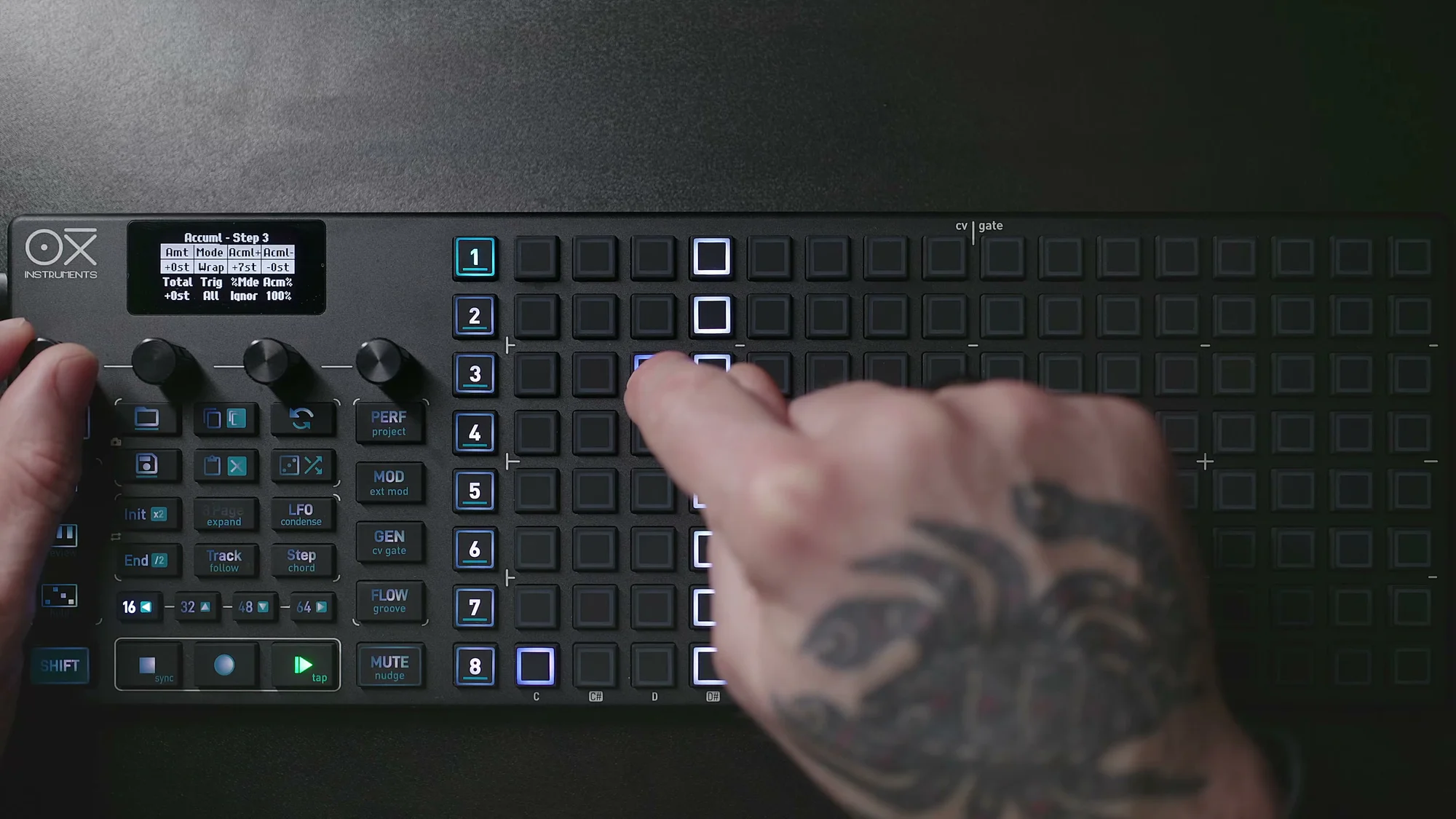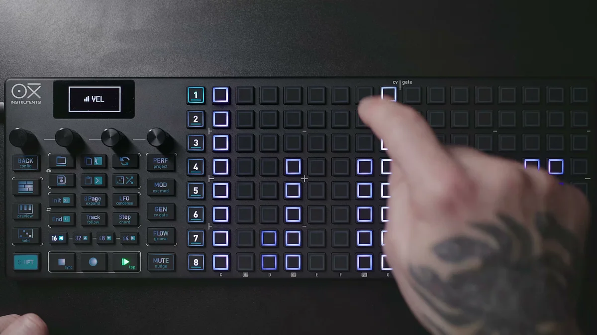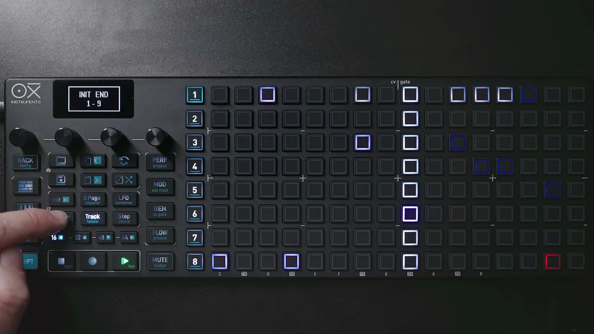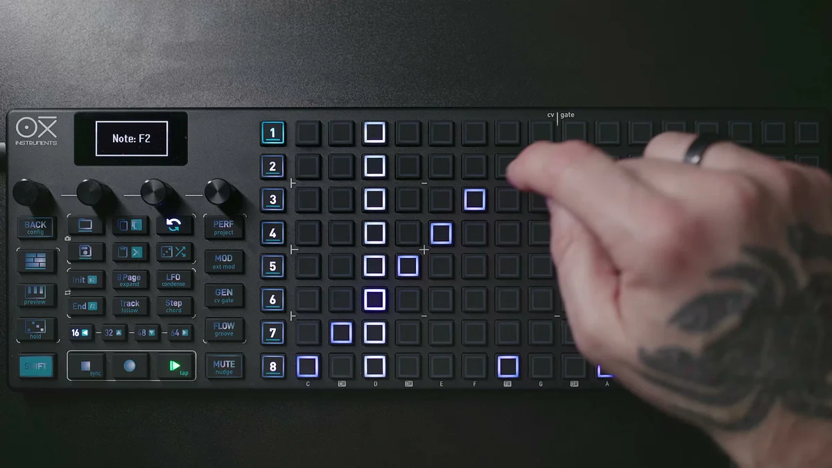 DAWのピアノロールエディターを使ったことがある人なら、見た目が似ているのですぐにイメージできるかと思います。ただしDAWと違って、OXI ONE MKIIのgridは8行×16列のパッドなので、同時に見える範囲は限られています。この制約の中で工夫するのも、ハードウェアシーケンサーならではの楽しさかなと。