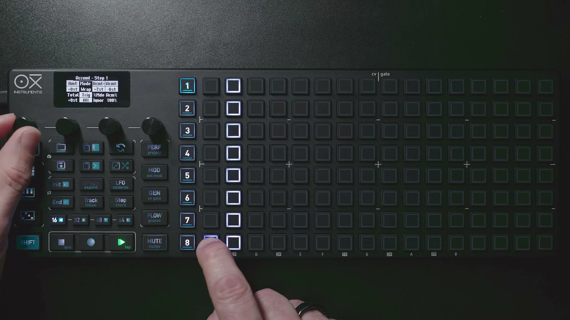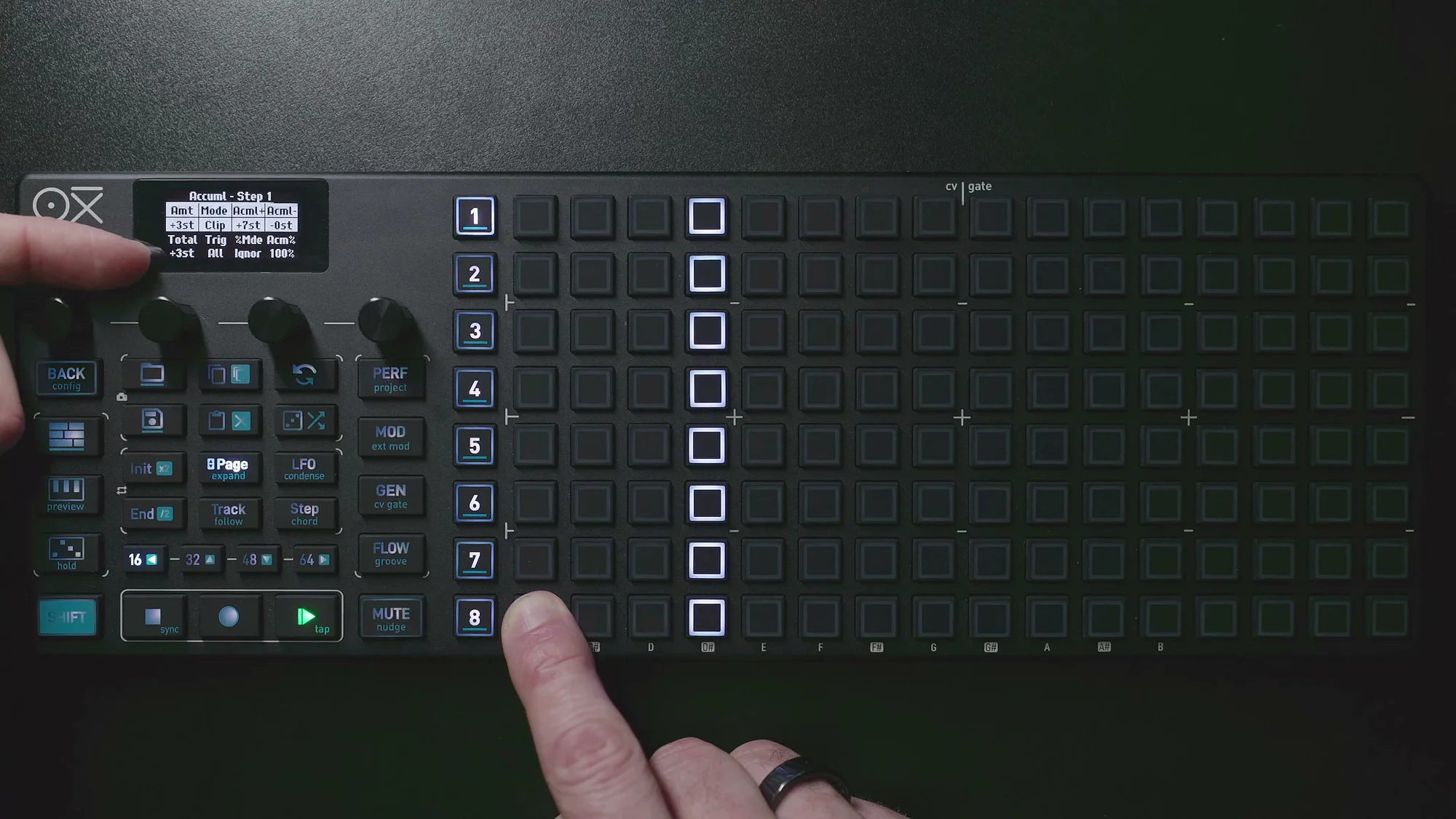 例えば、あるステップのアキュムレーターをFlowに、別のステップを!Flowに設定すると、Flowボタンを押すことで「どちらのステップが変化するか」を切り替えられます。押している間は前者が変化し後者が止まり、離すと逆になる。Performance画面でFlowボタンを操作しながらパターンをリアルタイムに変化させるのは、かなり楽しいです。