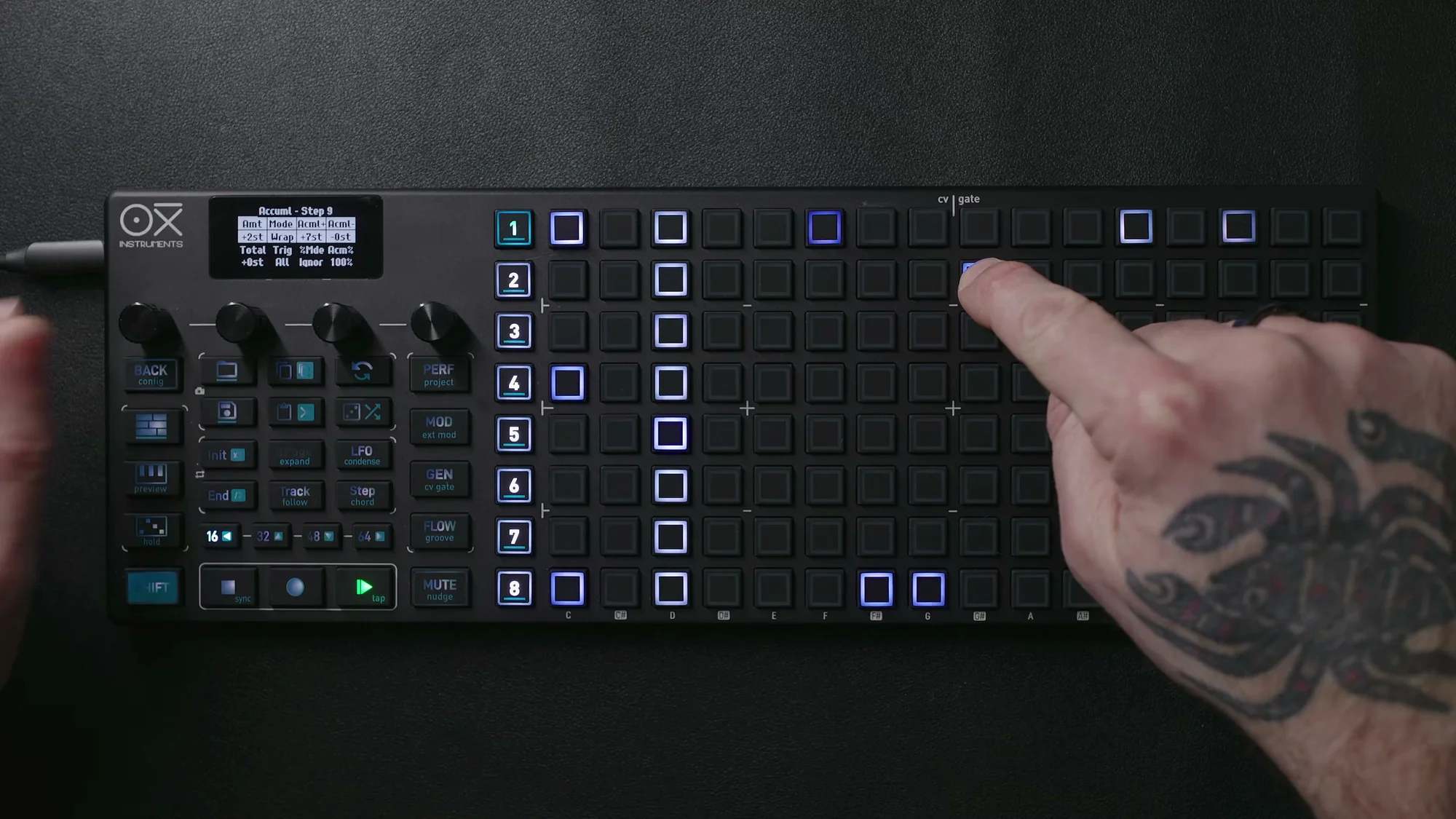 Poly Modeのアキュムレーターは、カラム内のすべてのノートに対して一括で適用されます。これを使うと、たとえばコード進行を繰り返すたびに徐々にベロシティが上がっていく(または下がっていく)ような、ハーモニックプログレッションの中での漸次的な変化を表現できます。