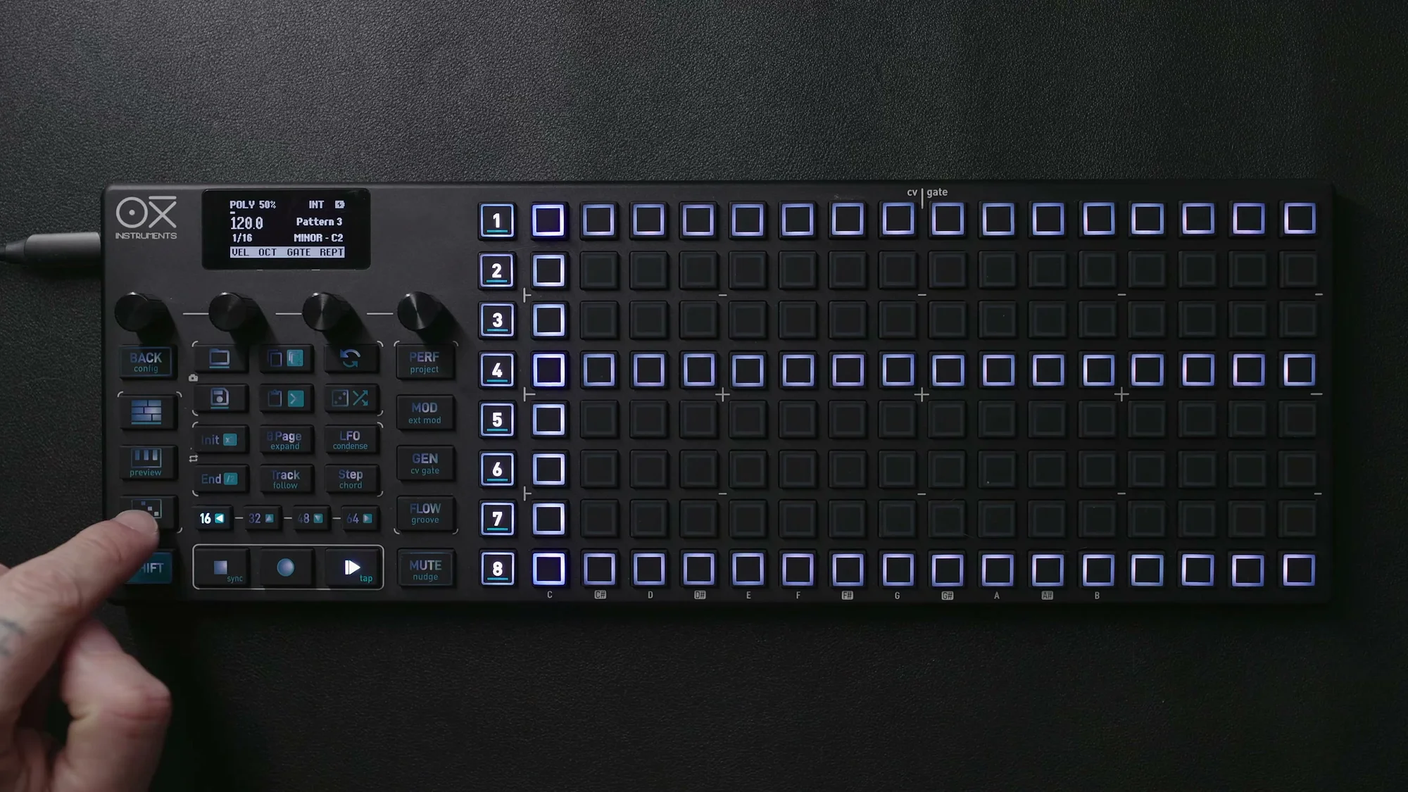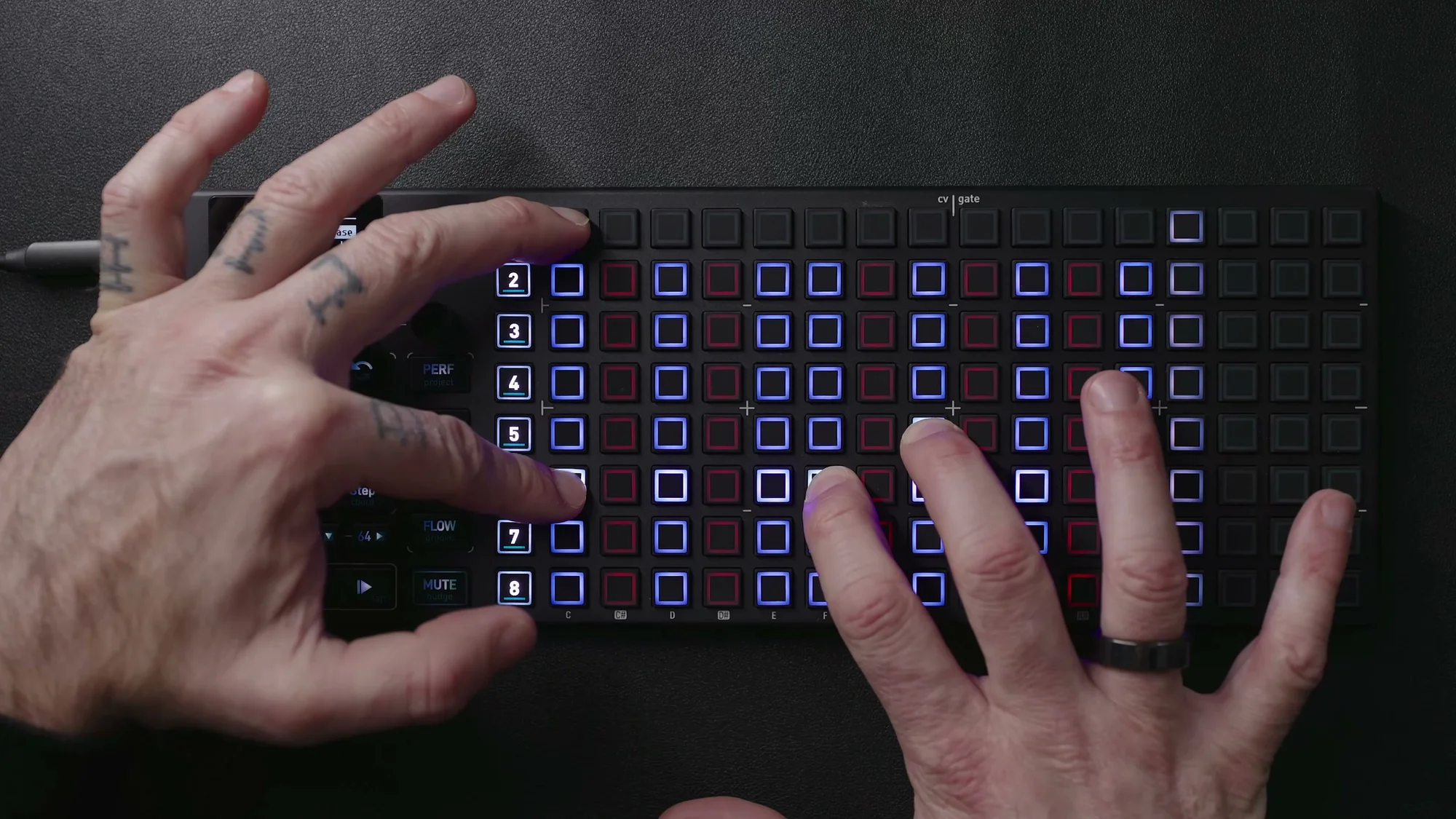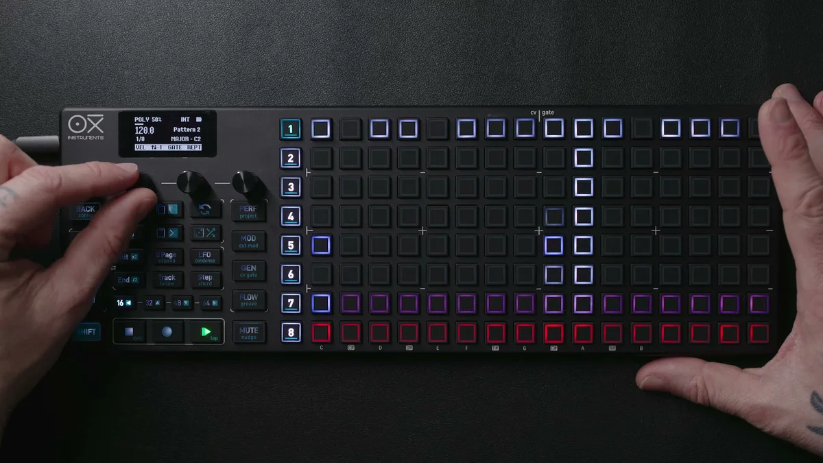 グリッドは8ページにわたって最大128ステップが使用可能で、Mono Modeと同様にEncoder 2で行を上下にスクロールして、表示範囲外のオクターブにもアクセスできます。現在の表示範囲外にノートがある場合は、グリッドの最上行または最下行に赤(下方向)や白(上方向)のインジケーターが表示されて、そこにノートがあることを示してくれます。