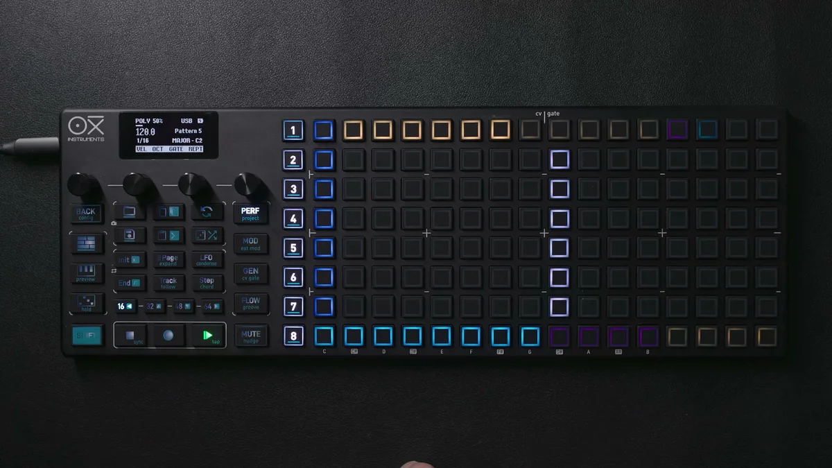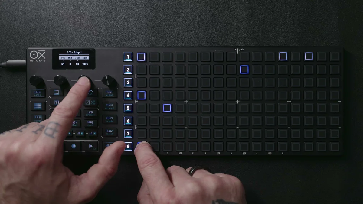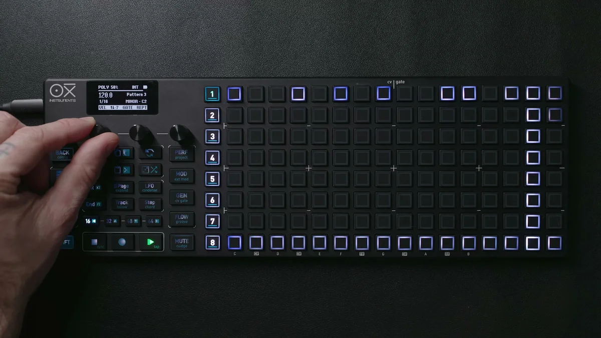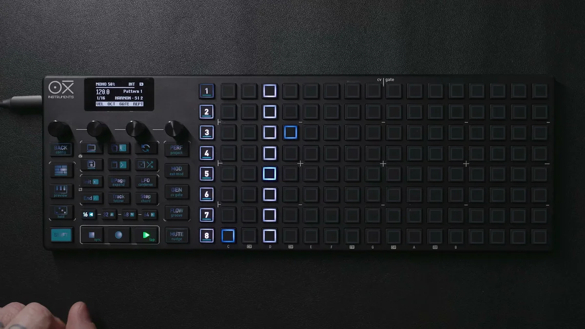 Poly Modeは1ステップあたり最大7音のポリフォニーを扱えるモードで、OXI ONE MKIIのシーケンサーモードの中で最も自由度が高いモードと言えます。Mono Modeは1ステップに1音のメロディックなライン、Chord Modeは事前に定義されたコード構造を配置するモードでしたが、Poly Modeではそういった制約なく、1ステップに好きな音を好きなだけ(7音まで)自由に配置できます。
