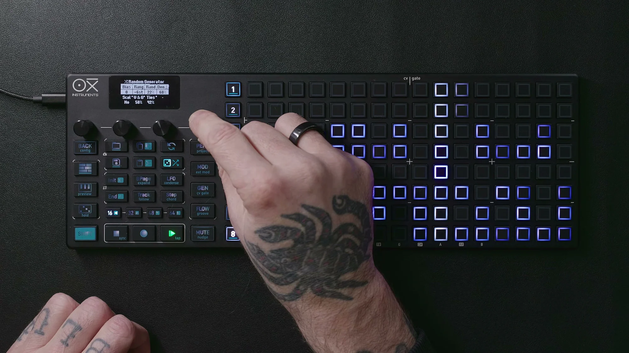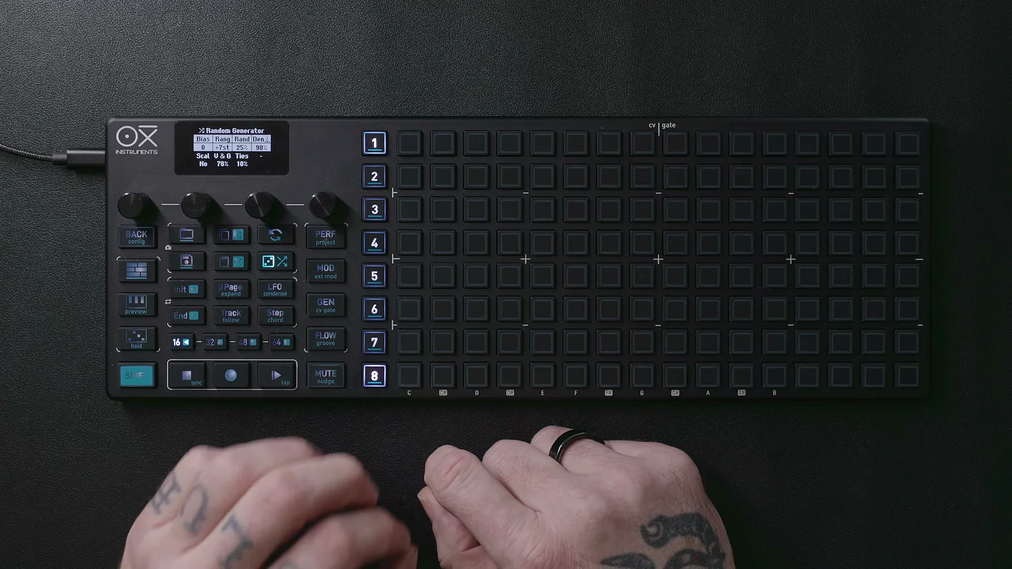Random Generatorは、OXI ONE MKIIに搭載されているパターン生成ツールです。「ランダム」という名前がついていますが、ただ適当にノートをばらまくだけのものではありません。7つのパラメーターを使って、音楽的に意味のあるパターンを生成できるように設計されています。公式の動画では「creative seeds(創造の種)」という表現が使われていましたが、まさにそんな感じで、ここで生成されたパターンをベースに、自分なりに磨き上げていくという使い方が想定されています。