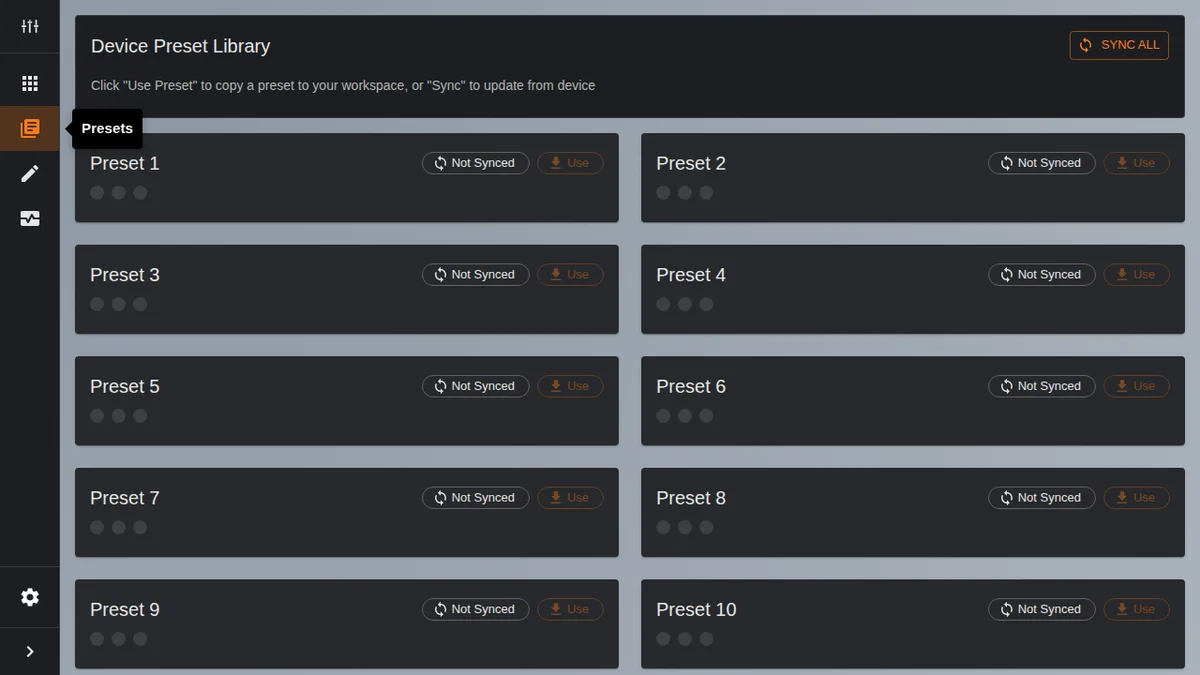 - Sync All: ページ上部のボタン。デバイスの全10プリセットを一括で読み込む