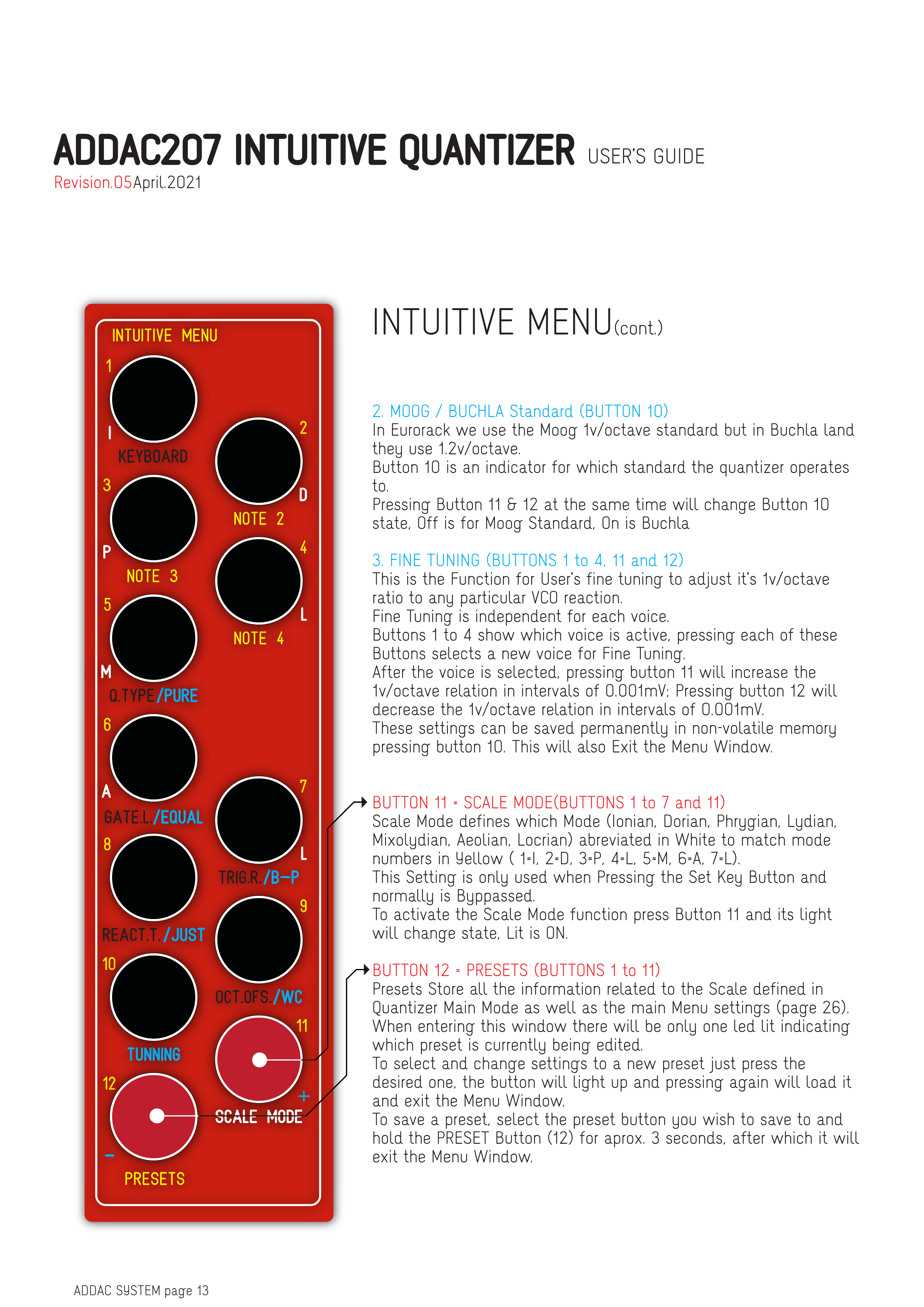 Voiceを選択後、button 11を押すと1v/octave関係が0.001mV単位で増加します。button 12を押すと1v/octave関係が0.001mV単位で減少します。