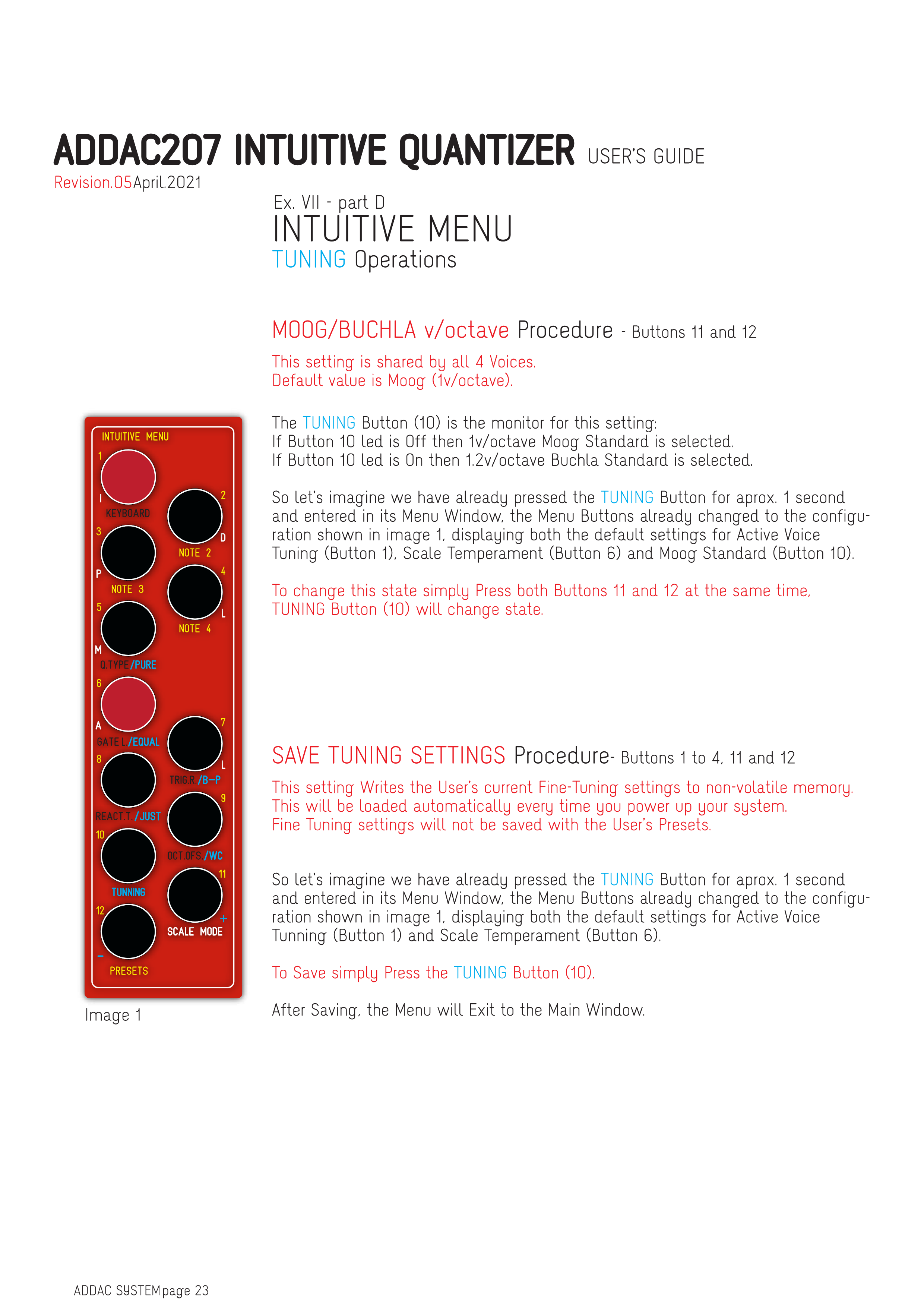 TUNINGボタンを約1秒間押してMenu Windowに入り、Menu Buttonsが画像1に示す設定に変更され、Active Voice Tuning(Button 1)、Scale Temperament(Button 6)、Moog Standard(Button 10)のデフォルト設定が表示されている状態を想像してください。