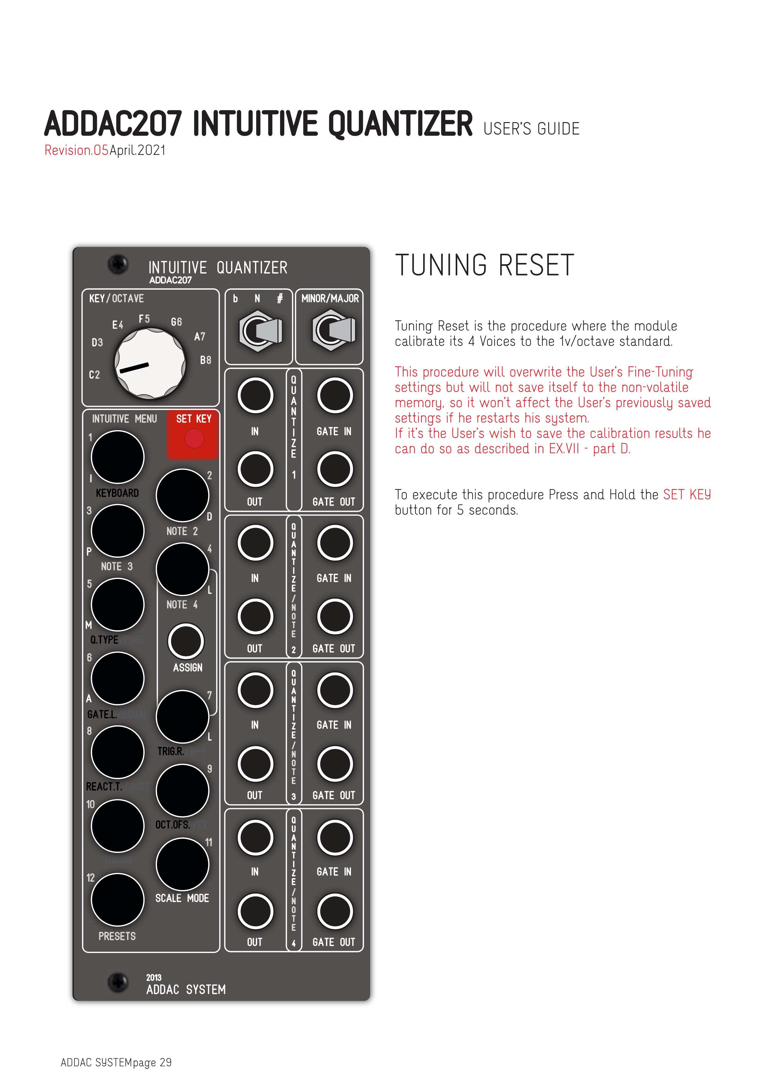 Tuning Resetは、モジュールの4つのVoiceを1V/オクターブ標準にキャリブレーションする手順です。