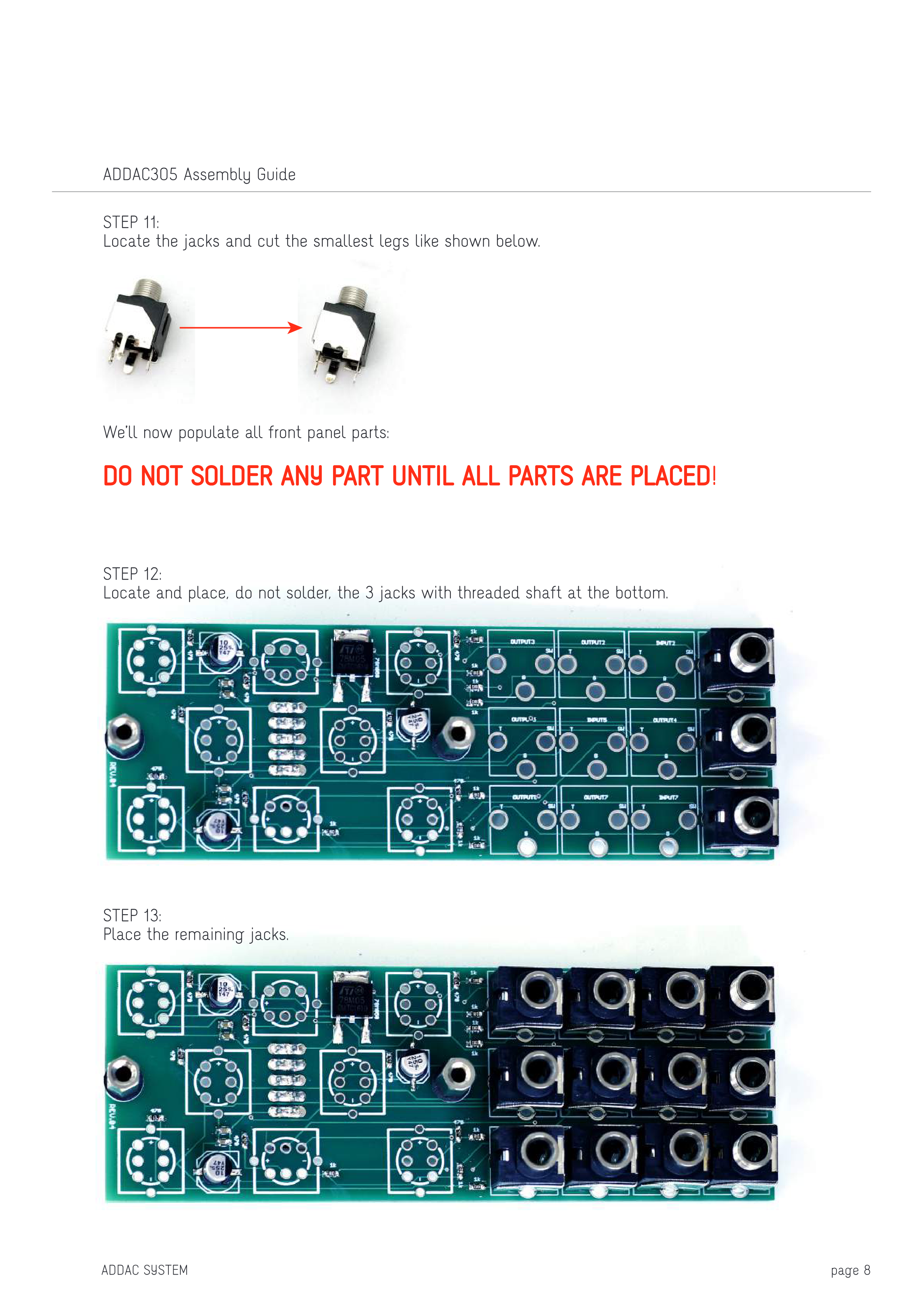 STEP 12: ネジ付きシャフトの3つのJackを底部に配置します。まだハンダ付けしないでください。 これからフロントパネルの全てのパーツを取り付けます: すべてのパーツを配置するまで、どのパーツもハンダ付けしないでください!