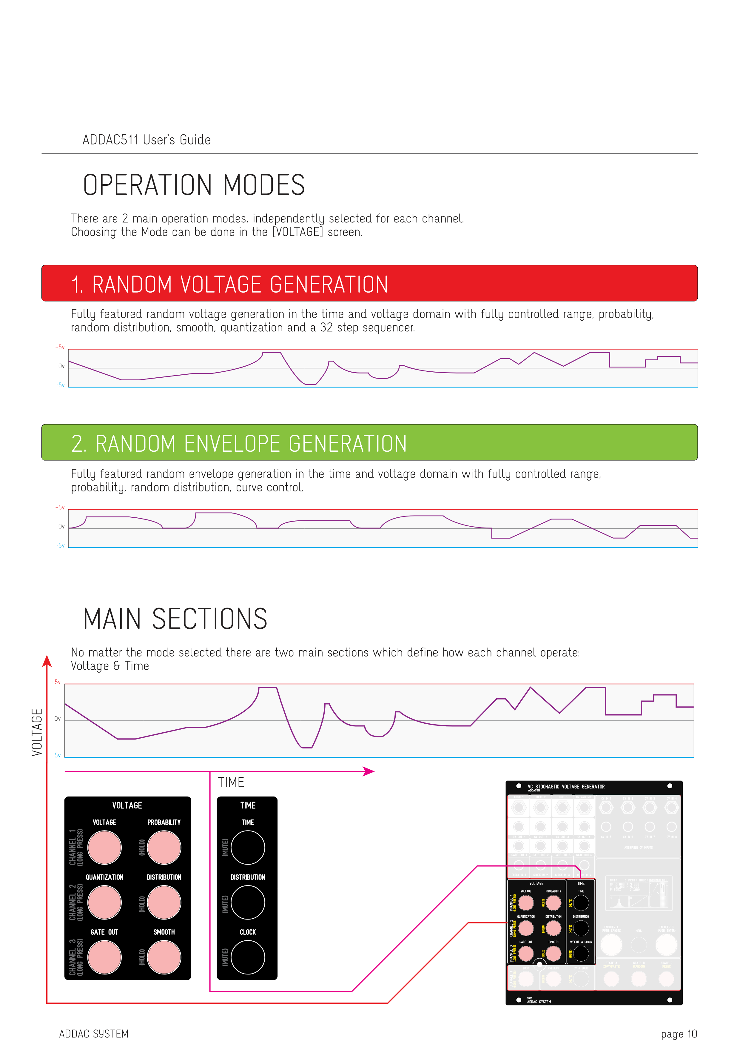 時間とボルテージのドメインで完全にフィーチャーされたランダムボルテージ生成機能を備え、レンジ、確率、ランダム分布、スムーズ、量子化、および32ステップSequencerを完全にコントロールできます。