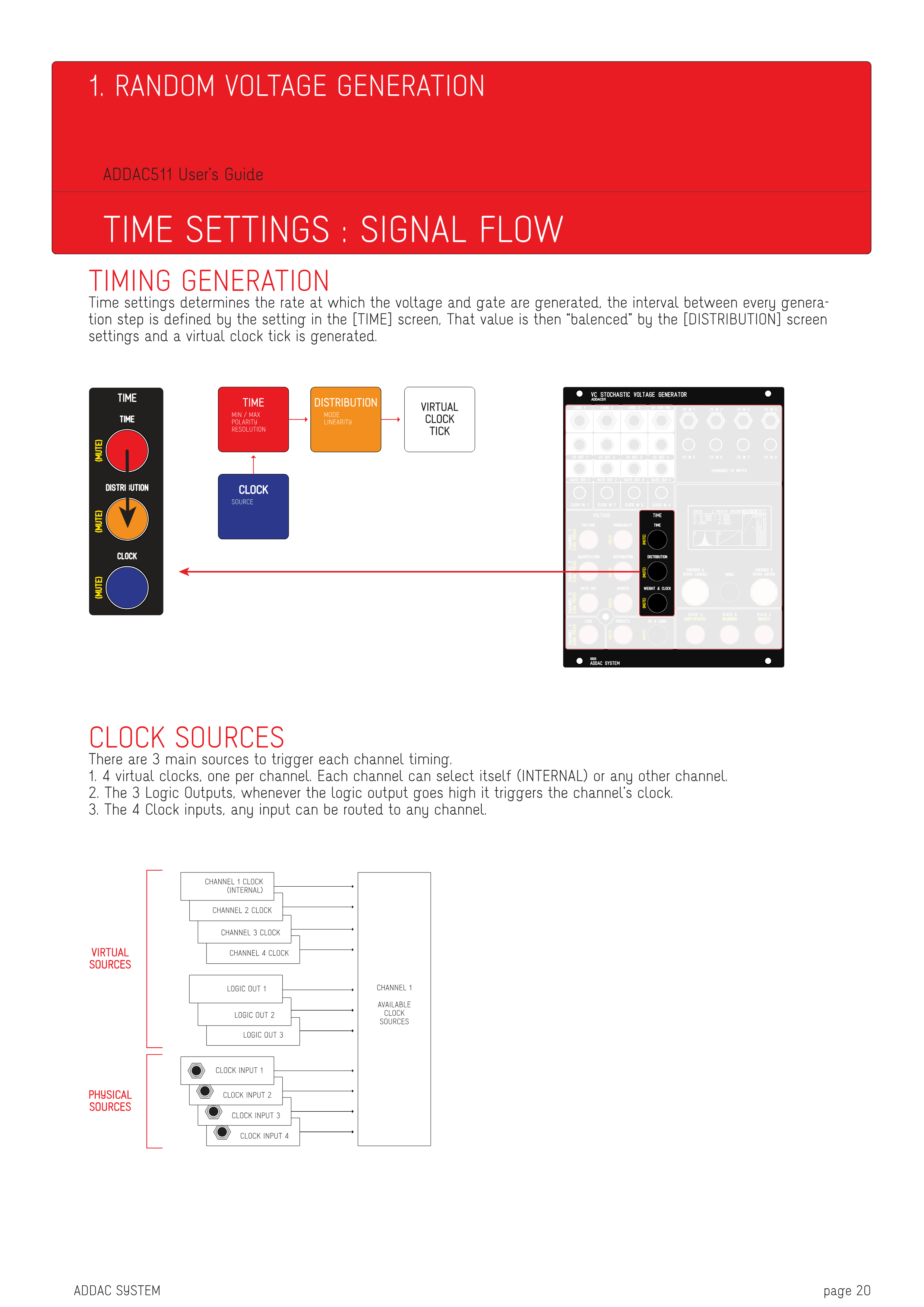 Time設定は、電圧とGateが生成される速度を決定します。各生成ステップ間の間隔は[TIME]画面の設定で定義されます。その値は[DISTRIBUTION]画面の設定によって「バランス」が調整され、仮想クロックティックが生成されます。