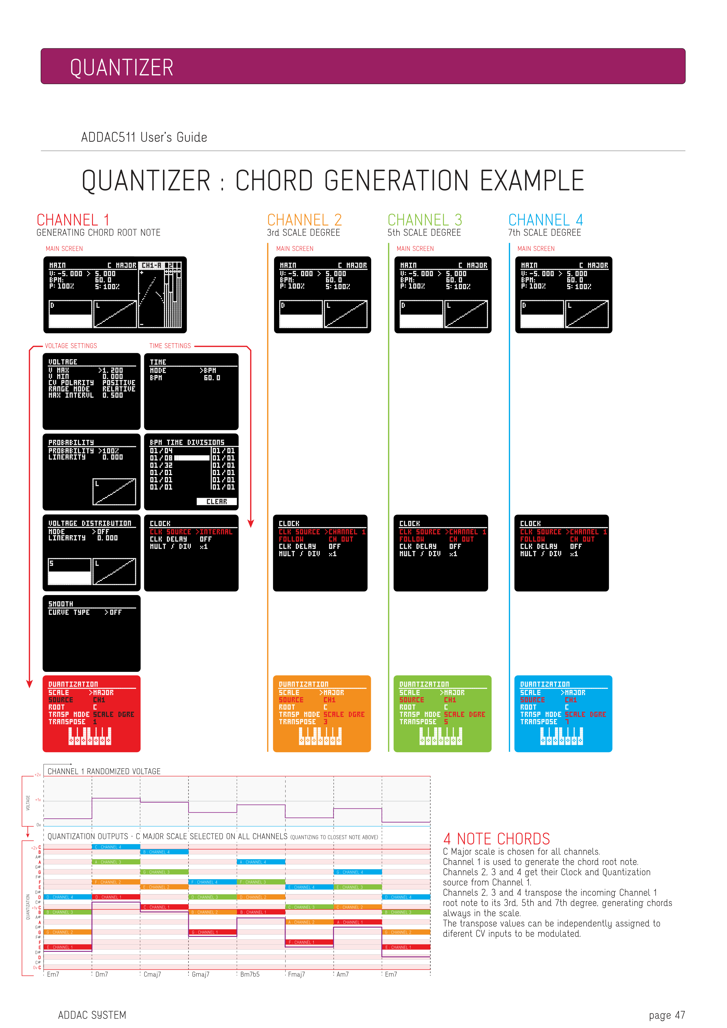 Channel 2、3、4は入力されたChannel 1のルート音を3度、5度、7度にトランスポーズし、常にスケール内でコードを生成します。