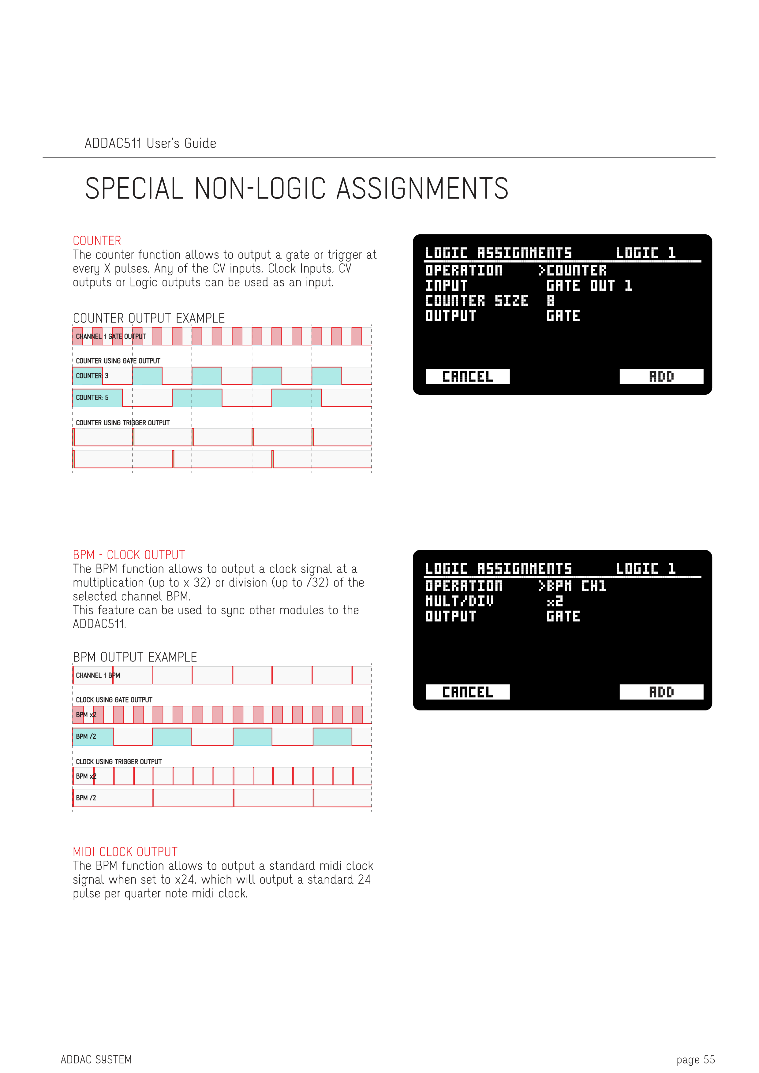 Counterファンクションは、X個のパルスごとにGateまたはTriggerを出力することができます。CV入力、Clock入力、CV出力、またはLogic出力のいずれかを入力として使用できます。