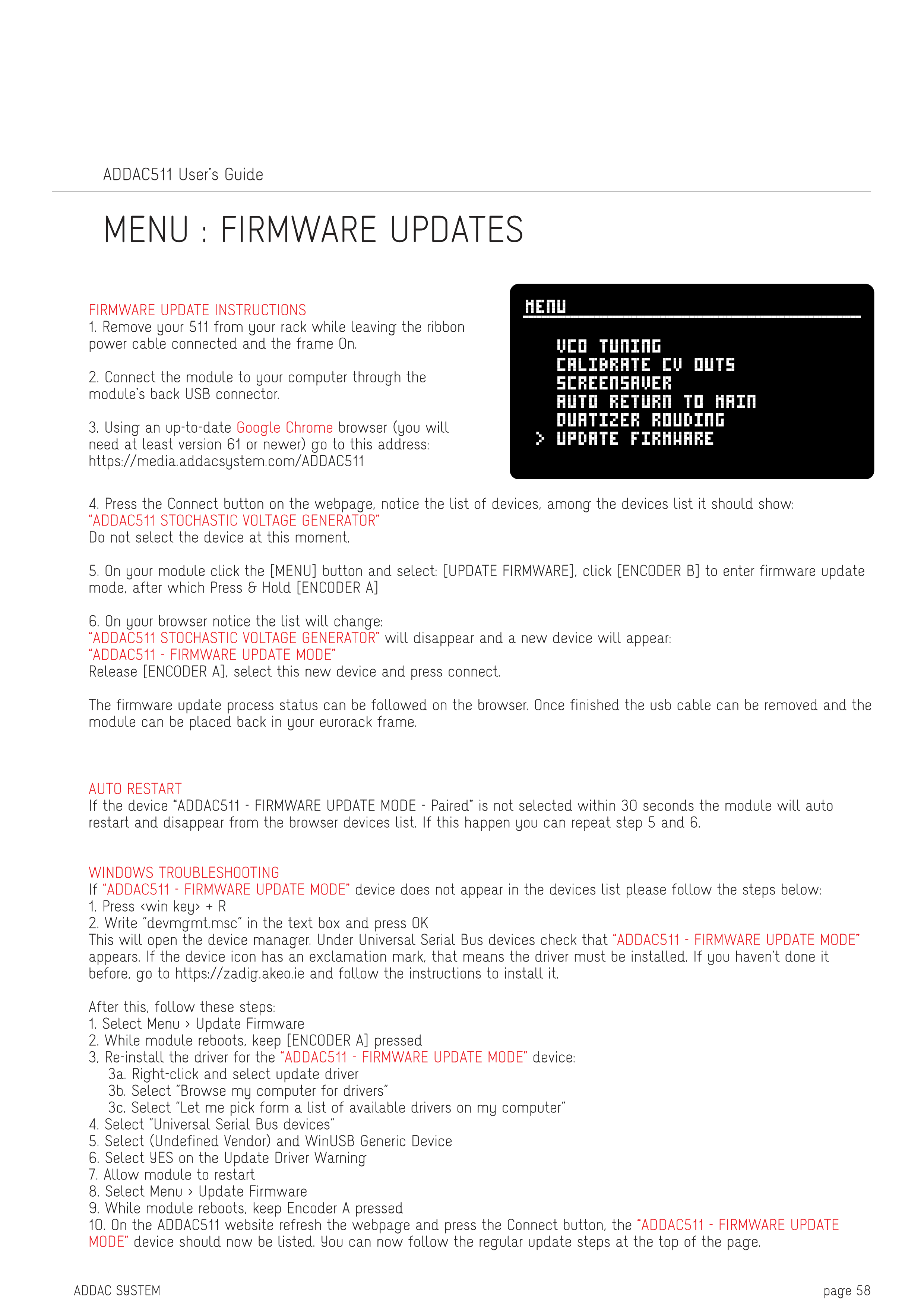 "ADDAC511 - FIRMWARE UPDATE MODE"デバイスがデバイスリストに表示されない場合は、以下の手順に従ってください: