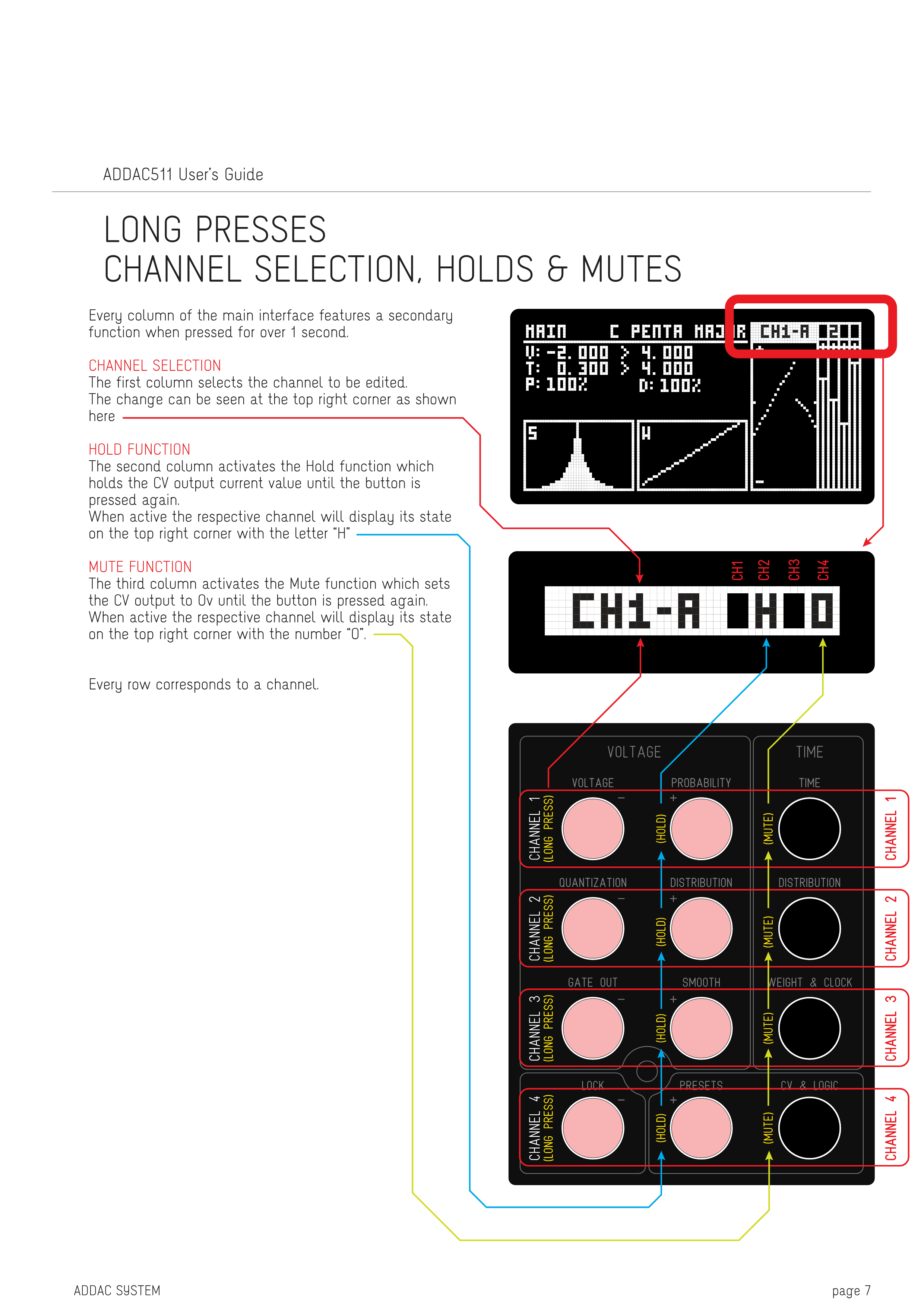 2列目はHold機能を有効にします。この機能は、ボタンが再度押されるまでCV出力の現在の値を保持します。