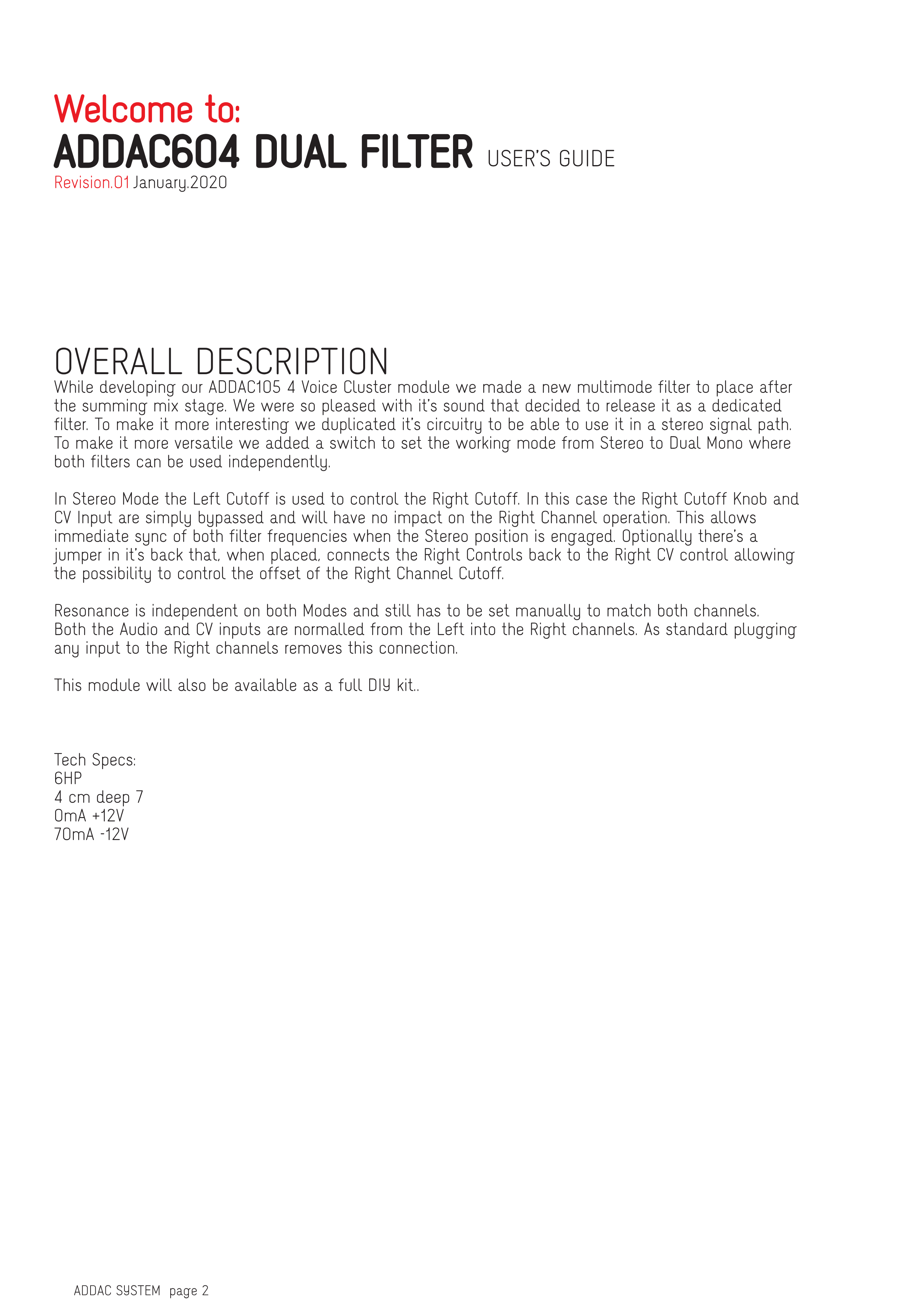 ADDAC105 4 Voice Clusterモジュールの開発中に、サミングミックスステージの後段に配置する新しいマルチモードフィルターを製作しました。そのサウンドに大変満足したため、専用フィルターとしてリリースすることを決定しました。より興味深いものにするため、ステレオ信号パスで使用できるように回路を複製しました。より汎用性を高めるため、動作モードをStereoからDual Monoに切り替えるスイッチを追加しました。Dual Monoでは両方のフィルターを独立して使用できます。