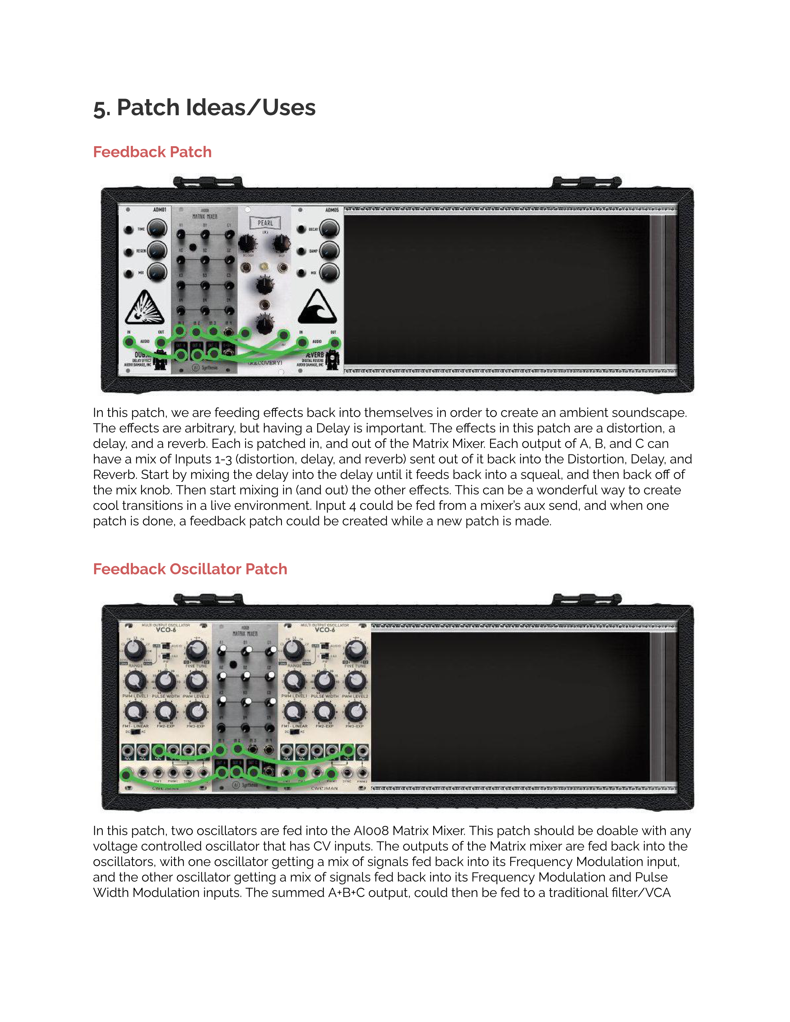 このパッチでは、2つのオシレーターがAI008 Matrix Mixerに入力されます。このパッチは、CV入力を持つ任意の電圧制御オシレーターで実現可能です。Matrix Mixerの出力はオシレーターにフィードバックされ、1つのオシレーターはFrequency Modulation入力にミックスされた信号のフィードバックを受け、もう1つのオシレーターはFrequency ModulationとPulse Width Modulation入力にミックスされた信号のフィードバックを受けます。合成されたA+B+C出力は、従来のfilter/VCAに送ることができます。