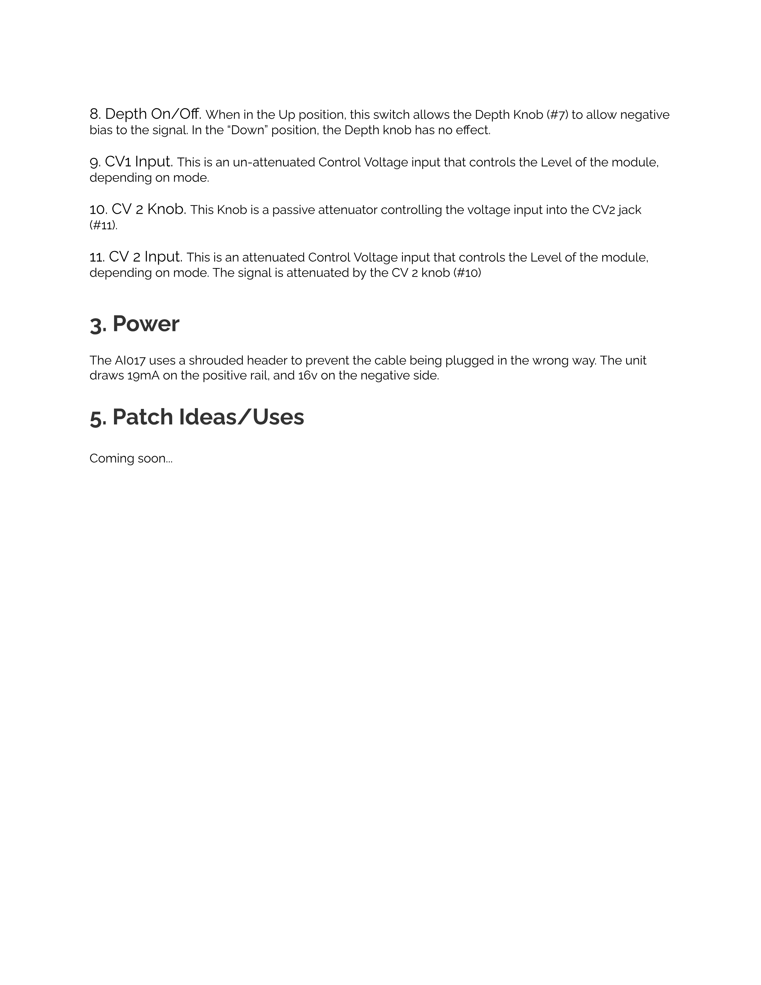 CV 2 Input。これはモジュールのレベルをコントロールする、アッテネートされたControl Voltage入力です(モードに依存)。信号はCV 2 Knob (#10) によってアッテネートされます。