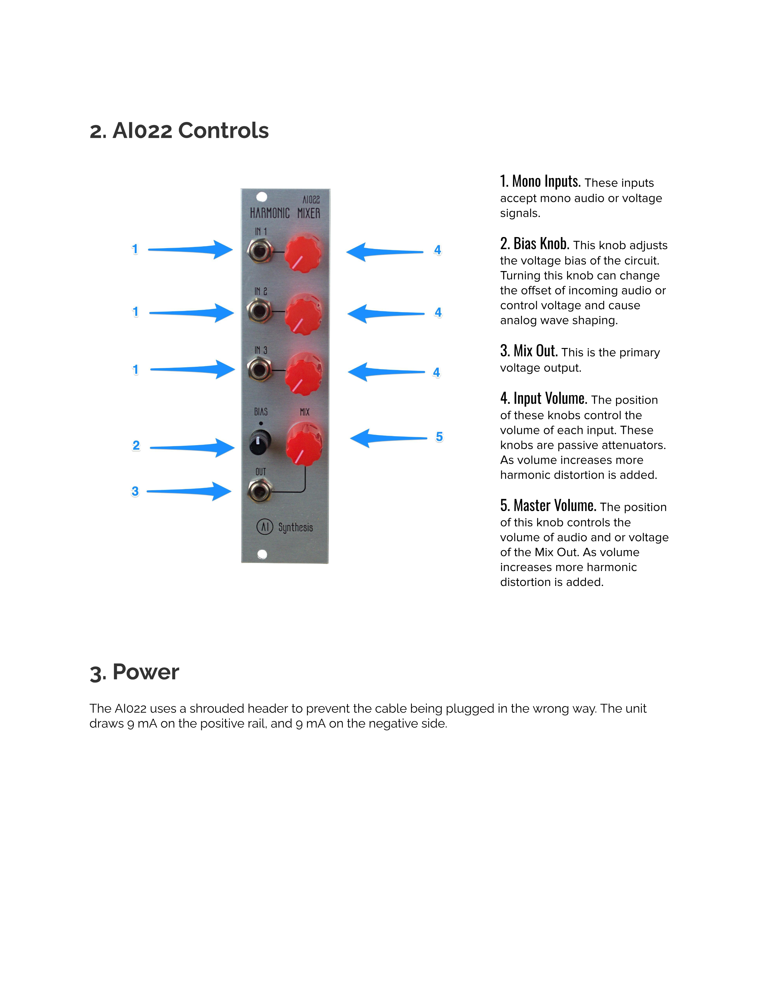 AI022は、ケーブルが誤った向きで接続されるのを防ぐため、シュラウド付きヘッダーを使用しています。このユニットは、正電源レールで9mA、負電源側で9mAを消費します。