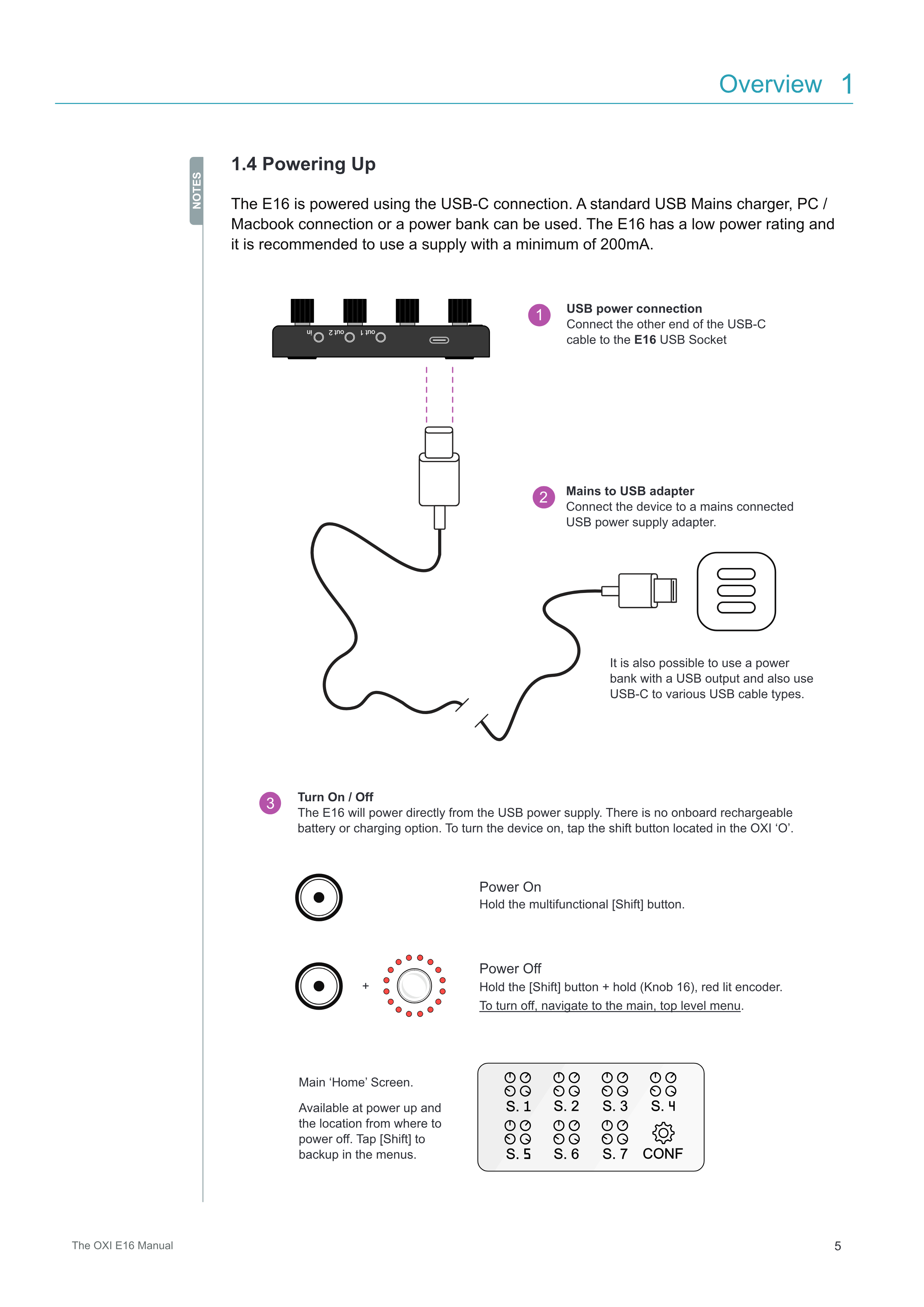 E16はUSB電源から直接電力を供給します。充電式バッテリーや充電オプションはありません。デバイスの電源を入れるには、OXIの「O」の中にあるshiftボタンをタップします。