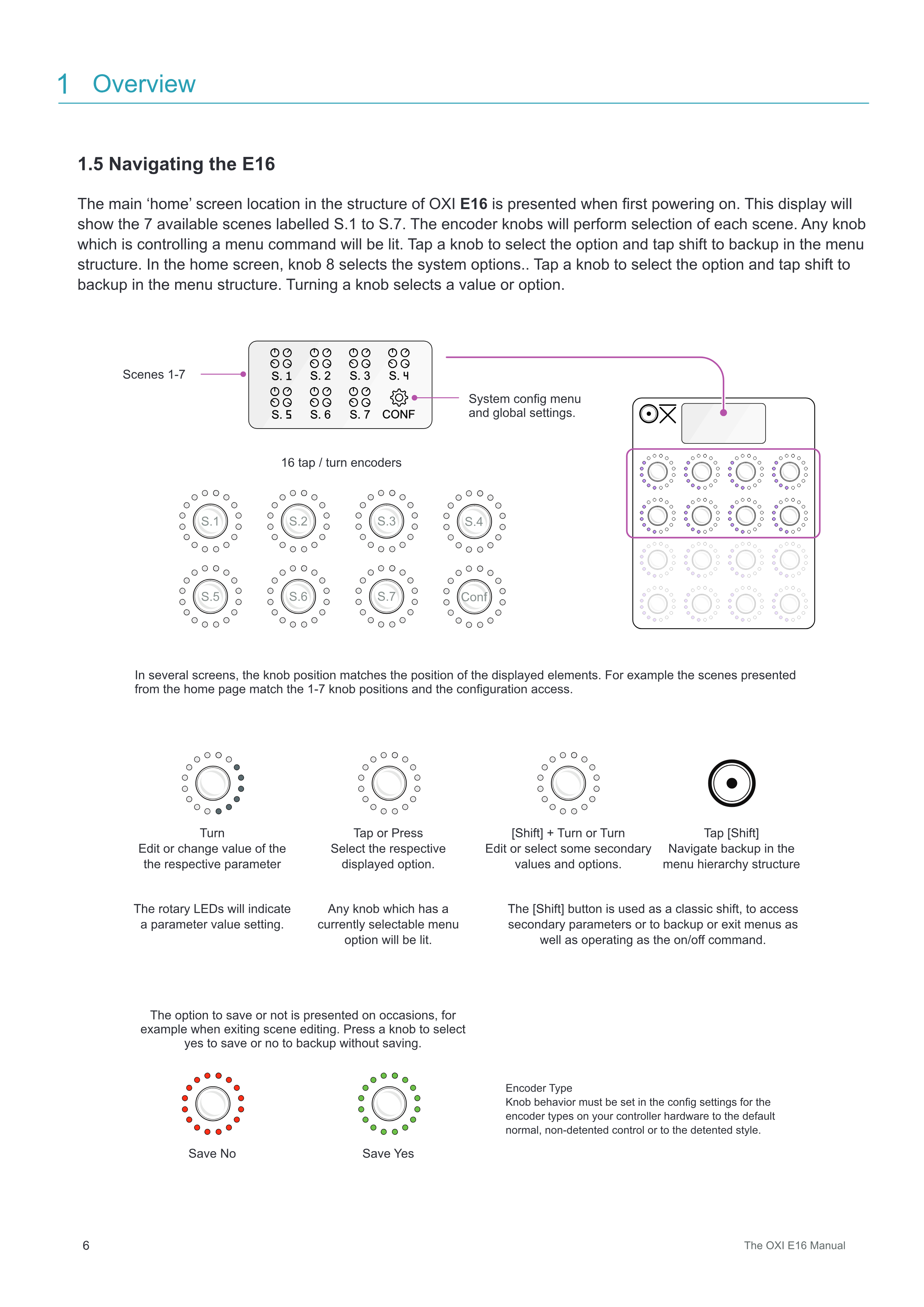 OXI E16の構造におけるメインの「ホーム」画面の位置は、電源投入時に最初に表示されます。このディスプレイには、S.1からS.7とラベル付けされた7つの利用可能なシーンが表示されます。Encoderノブで各シーンを選択します。メニューコマンドをコントロールしているノブは点灯します。ノブをタップしてオプションを選択し、Shiftをタップしてメニュー構造内で戻ります。ホーム画面では、ノブ8がシステムオプションを選択します。ノブをタップしてオプションを選択し、Shiftをタップしてメニュー構造内で戻ります。ノブを回すと値やオプションが選択されます。
