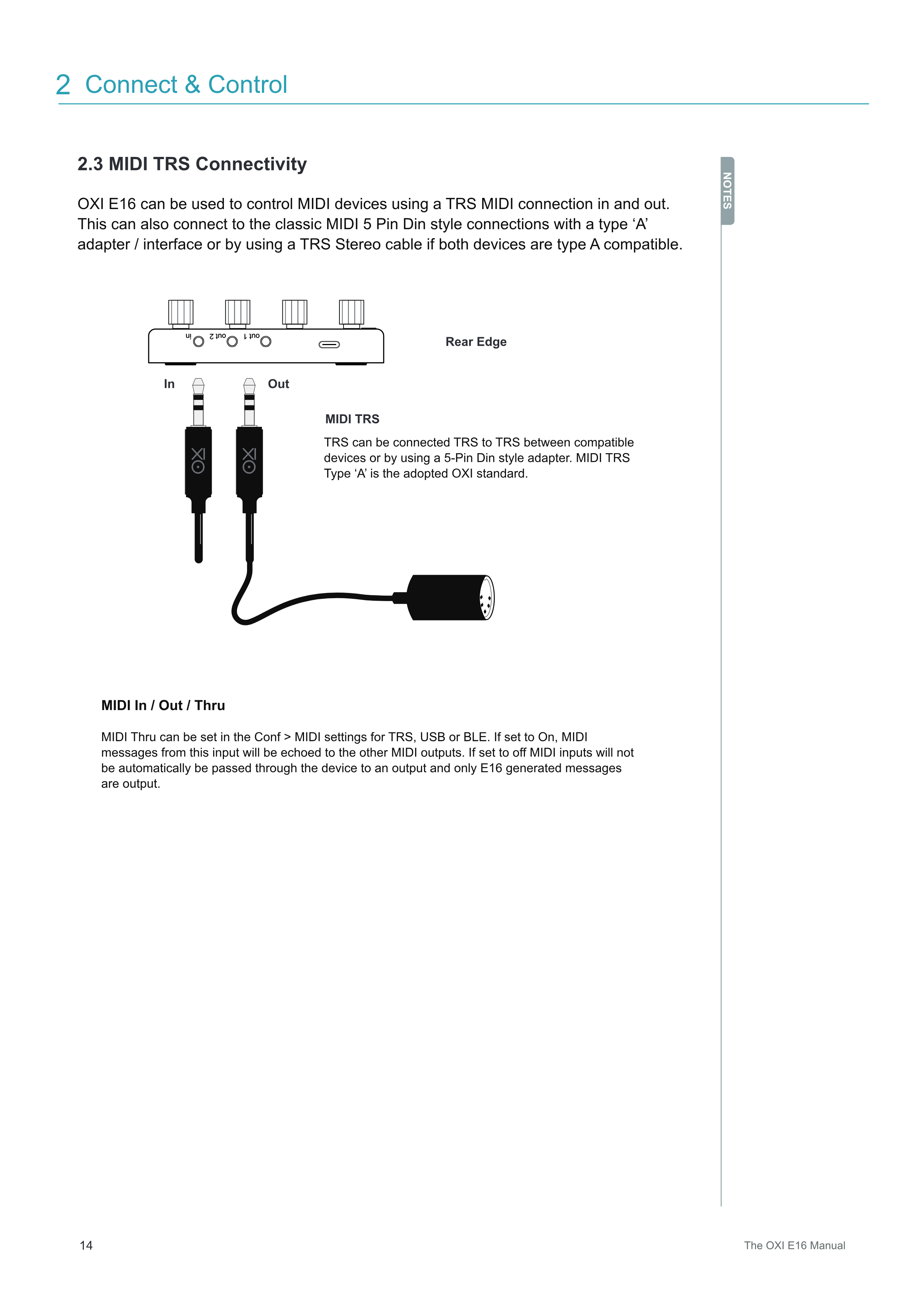 OXI E16は、TRS MIDI接続のインとアウトを使用してMIDIデバイスをコントロールできます。これは、タイプ'A'のアダプター/インターフェイスを使用することで、クラシックなMIDI 5ピンDinスタイルの接続にも対応できます。または、両方のデバイスがタイプA互換の場合は、TRSステレオケーブルを使用して接続できます。