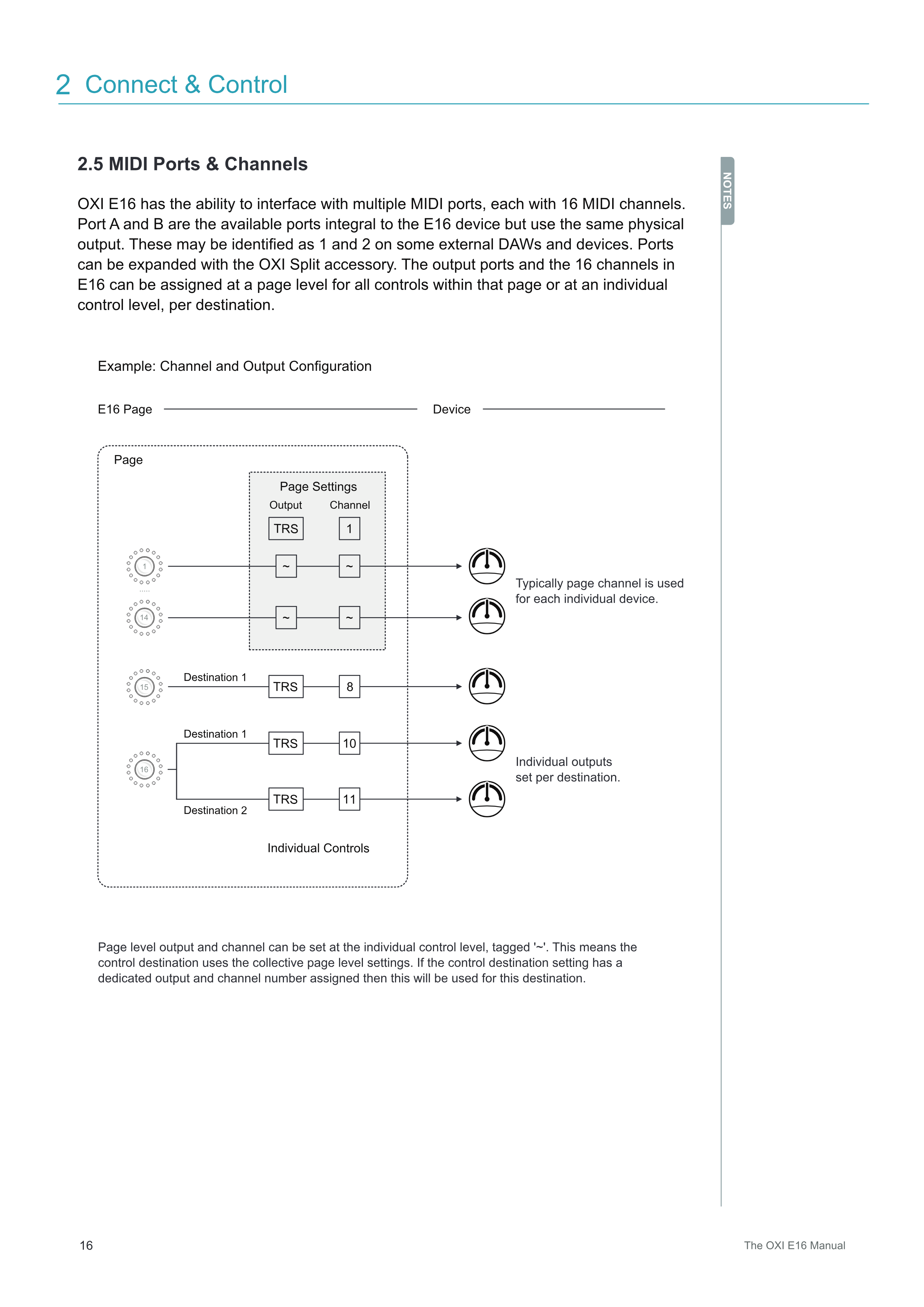 ポートAとBは、E16デバイスに内蔵された利用可能なポートですが、同じ物理出力を使用します。これらは一部の外部DAWやデバイスでは1および2として識別される場合があります。ポートはOXI Splitアクセサリーで拡張できます。E16の出力ポートと16チャンネルは、そのページ内のすべてのコントロールに対してページレベルで割り当てることも、送信先ごとに個別のコントロールレベルで割り当てることもできます。