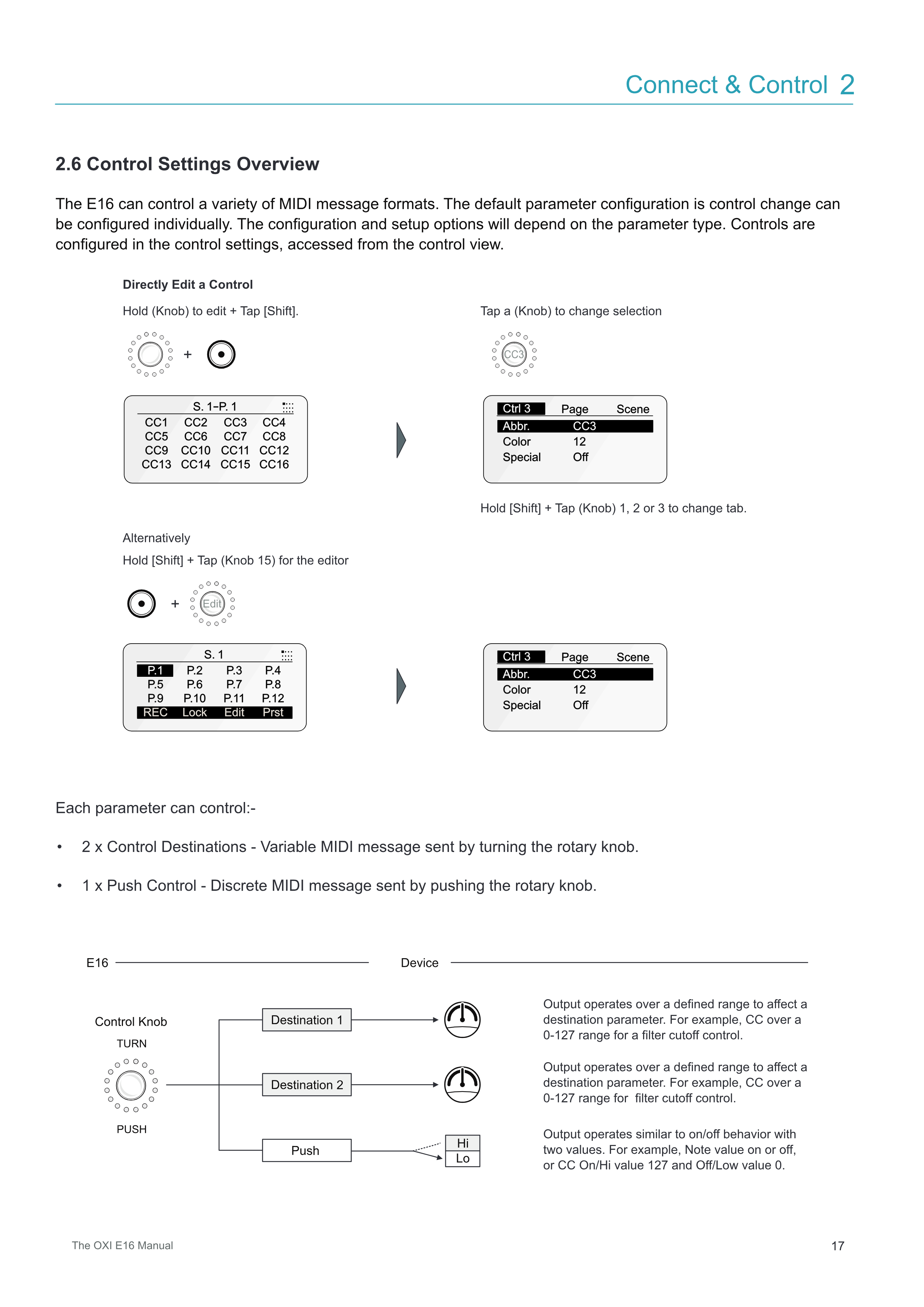 E16は様々なMIDIメッセージフォーマットをコントロールできます。デフォルトのパラメーター設定はControl Changeで、個別に設定できます。設定とセットアップのオプションはパラメータータイプによって異なります。Controlsはcontrol settingsで設定され、control viewからアクセスします。