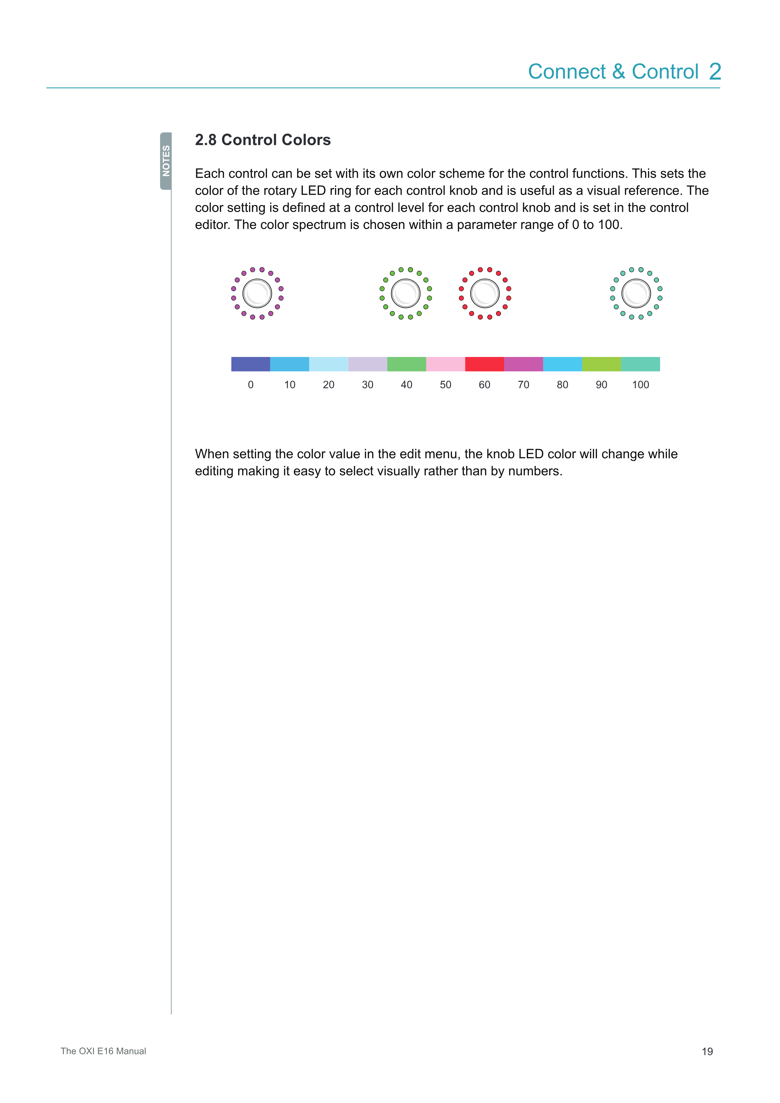 各Controlには、Control機能用に独自のカラースキームを設定できます。これにより、各ControlノブのロータリーLEDリングの色が設定され、視覚的な参照として役立ちます。色の設定はControlレベルで各Controlノブごとに定義され、Controlエディターで設定します。カラースペクトラムは0から100のパラメーター範囲内で選択されます。
