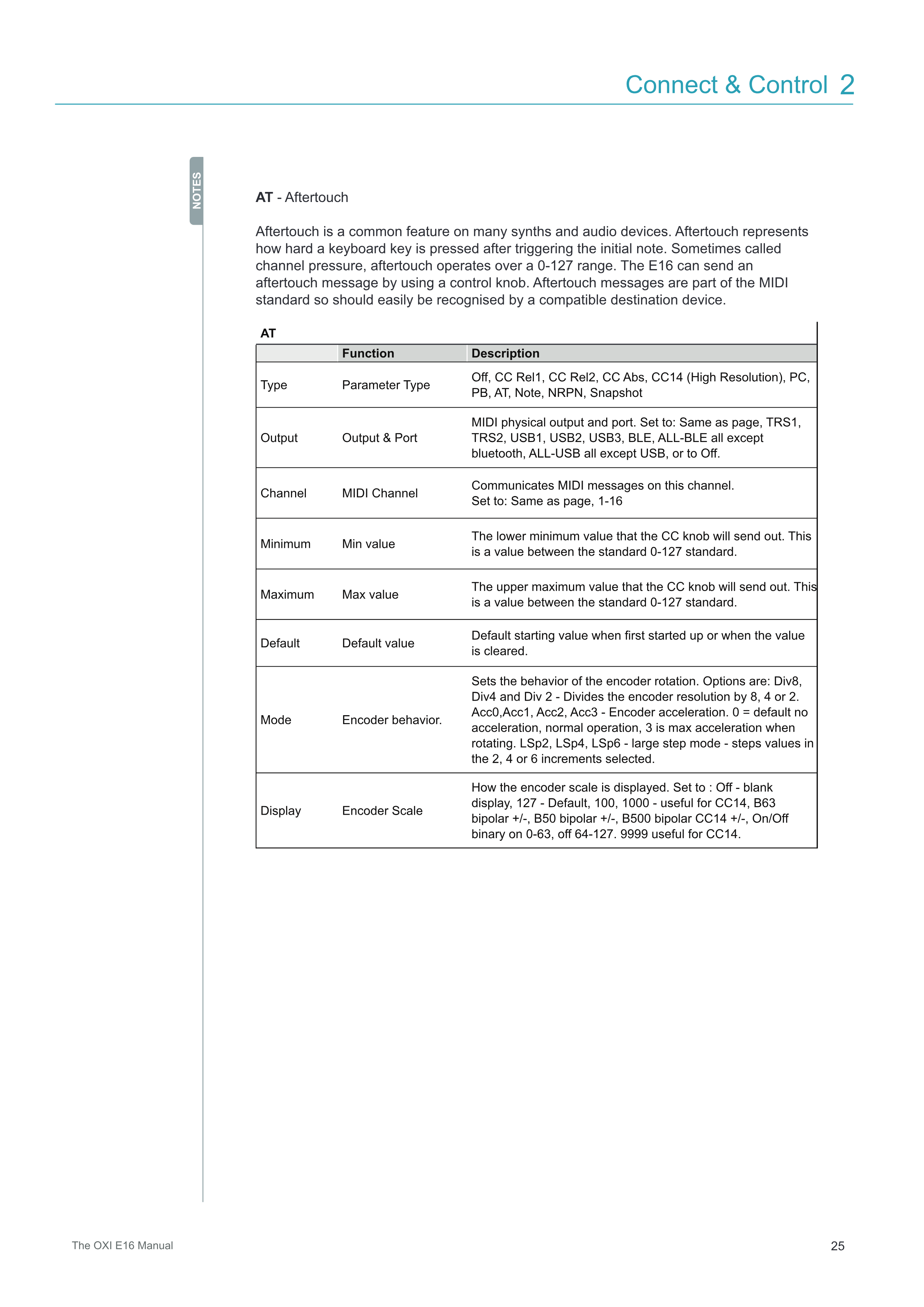 Aftertouchは多くのシンセやオーディオデバイスに共通する機能です。Aftertouchは、最初の音符をトリガーした後、キーボードのキーがどれだけ強く押されているかを表します。チャンネルプレッシャーとも呼ばれ、Aftertouchは0-127の範囲で動作します。E16はコントロールノブを使用してAftertouchメッセージを送信できます。AftertouchメッセージはMIDI標準の一部であるため、互換性のある送信先デバイスで簡単に認識されます。