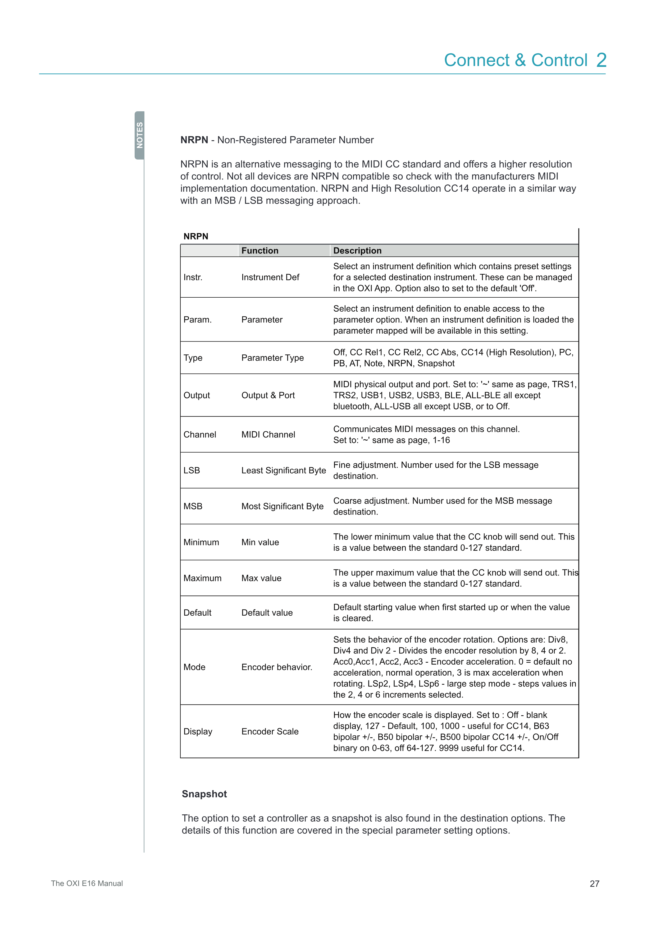 NRPNはMIDI CC標準に代わるメッセージング方式で、より高い解像度のコントロールを提供します。すべてのデバイスがNRPN互換ではないため、メーカーのMIDI実装ドキュメントを確認してください。NRPNと高解像度CC14は、MSB / LSBメッセージングアプローチにおいて同様の方法で動作します。