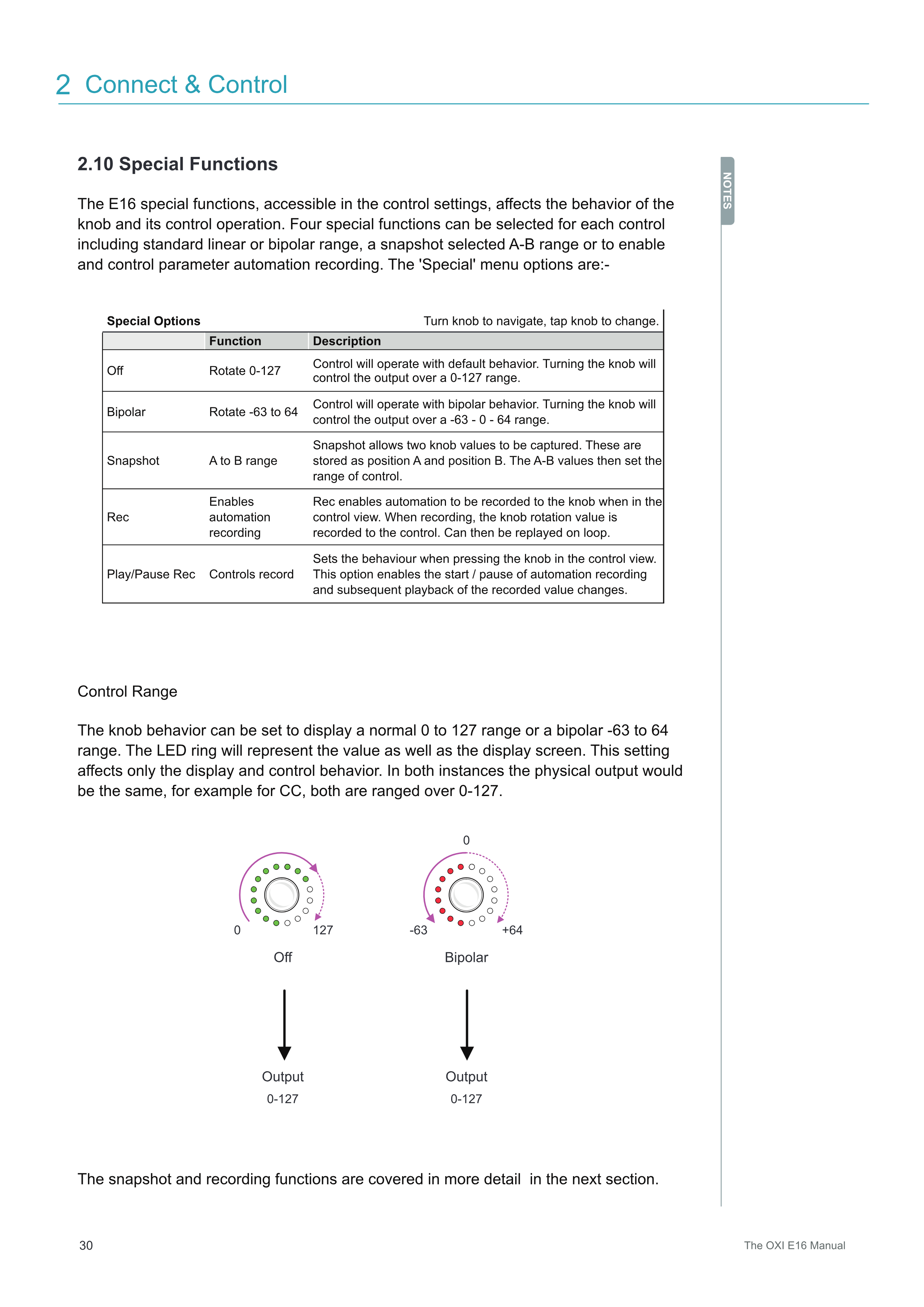 E16のスペシャル機能は、コントロール設定からアクセスでき、Knobとそのコントロール操作の動作に影響を与えます。各コントロールに対して4つのスペシャル機能を選択できます。標準的なリニアまたはバイポーラ範囲、スナップショットで選択されたA-B範囲、またはパラメーターオートメーション記録の有効化とコントロールが含まれます。「Special」メニューのオプションは以下の通りです。