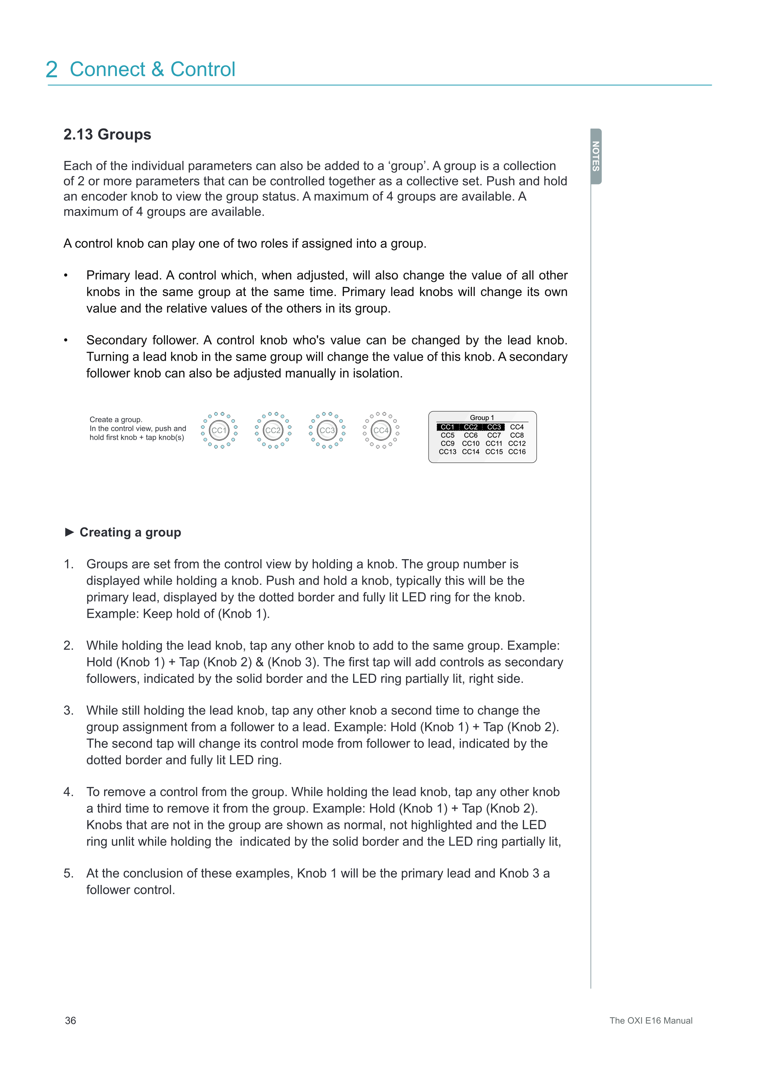 グループは、コントロールビューでノブを押し続けることで設定します。ノブを押し続けている間、グループ番号が表示されます。ノブを押し続けると、通常はprimary leadとして表示され、点線の枠と完全に点灯したLEDリングで示されます。 例:(Knob 1)を押し続けます。