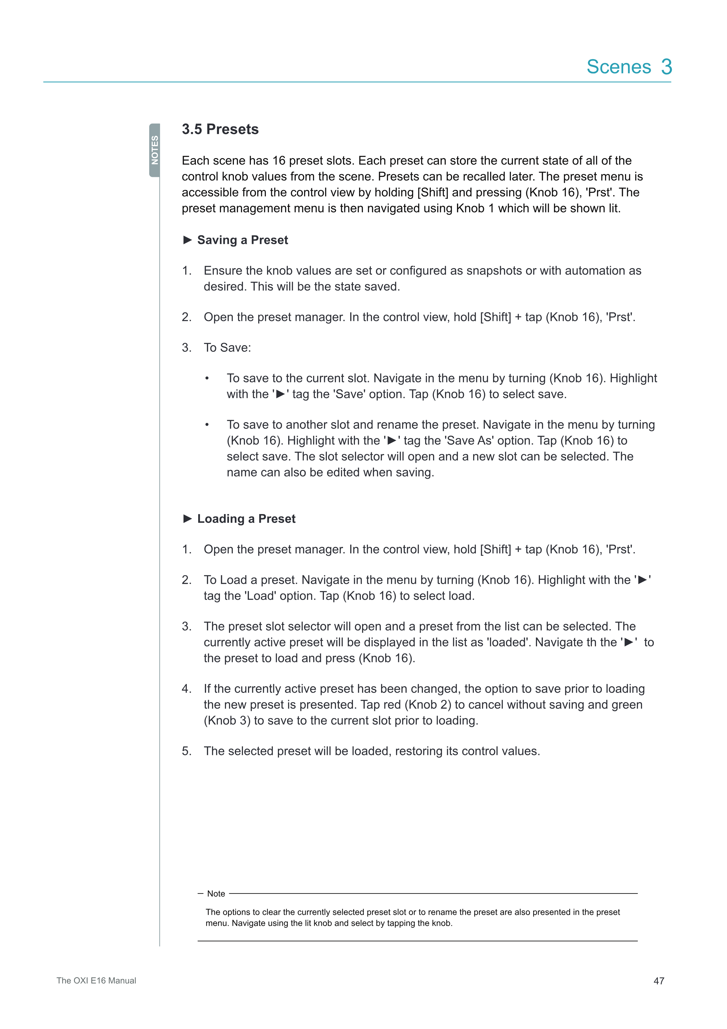 各Sceneには16個のPresetスロットがあります。各Presetは、Sceneのすべてのコントロールknobの値の現在の状態を保存できます。Presetは後で呼び出すことができます。PresetメニューはControl Viewからアクセスでき、[Shift]を押しながら(Knob 16)「Prst」を押します。Presetの管理メニューは、点灯表示されるKnob 1を使用してナビゲートします。