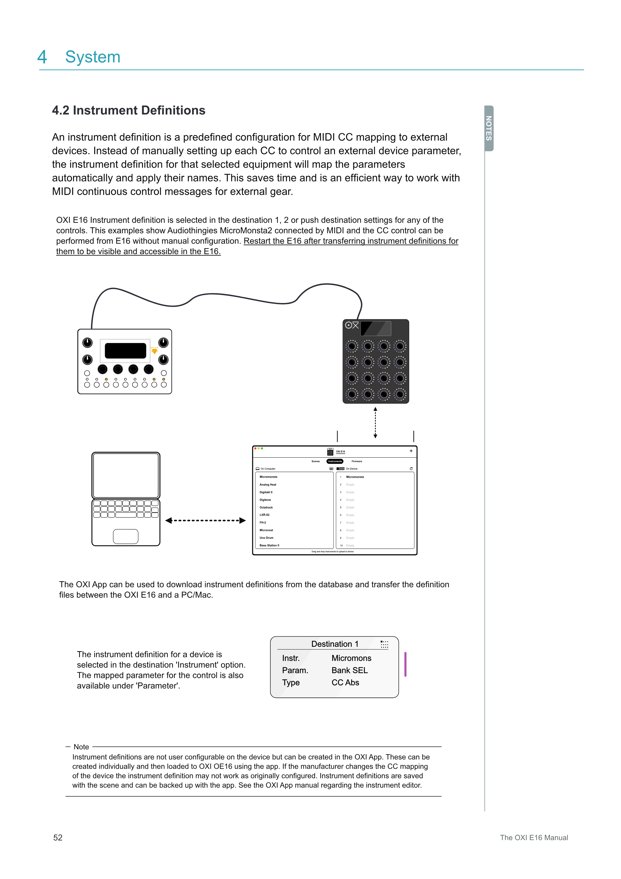 Instrument definitionはデバイス上でユーザー設定できませんが、OXI Appで作成できます。これらは個別に作成し、アプリを使用してOXI E16にロードできます。メーカーがデバイスのCCマッピングを変更した場合、instrument definitionは元の設定通りに機能しない可能性があります。Instrument definitionはsceneと共に保存され、アプリでバックアップできます。Instrument editorについては、OXI Appマニュアルを参照してください。