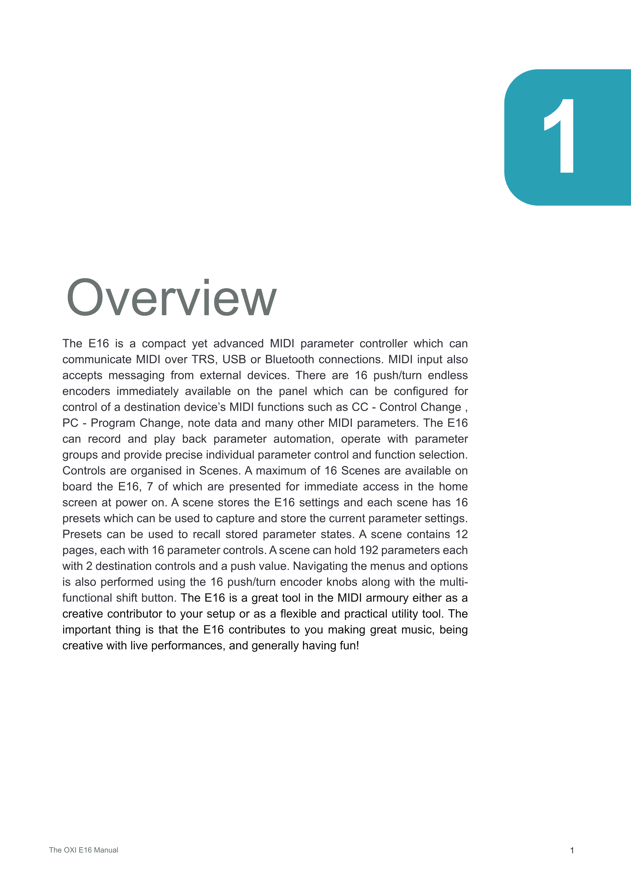 コントロールはSceneで整理されています。E16には最大16のSceneが搭載可能で、そのうち7つが電源投入時のホーム画面ですぐにアクセスできるよう表示されます。Sceneには E16の設定が保存され、各Sceneには16個のプリセットがあり、現在のパラメーター設定をキャプチャして保存できます。プリセットを使用して、保存されたパラメーター状態を呼び出すことができます。Sceneには12のページがあり、各ページに16のパラメーターコントロールがあります。Sceneは192のパラメーターを保持でき、それぞれに2つのデスティネーションコントロールとプッシュ値があります。メニューとオプションのナビゲーションも、多機能シフトボタンと共に16個のプッシュ/ターン式エンコーダーノブを使用して行います。E16は、セットアップへのクリエイティブな貢献者として、あるいは柔軟で実用的なユーティリティツールとして、MIDIの武器庫における優れたツールです。重要なのは、E16が素晴らしい音楽制作、ライブパフォーマンスでのクリエイティビティ、そして何よりも楽しむことに貢献することです!