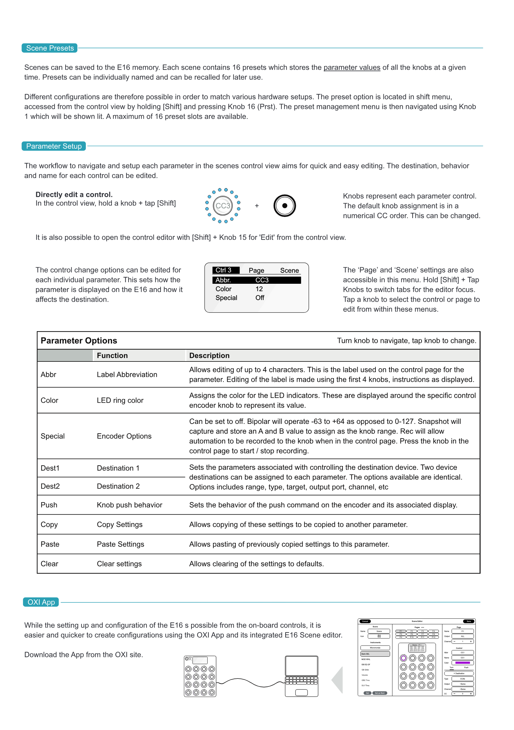 E16のボード上のcontrolから設定と構成を行うことは可能ですが、OXI Appとその統合されたE16 Scene editorを使用して構成を作成する方が簡単で高速です。AppはOXIサイトからダウンロードしてください。