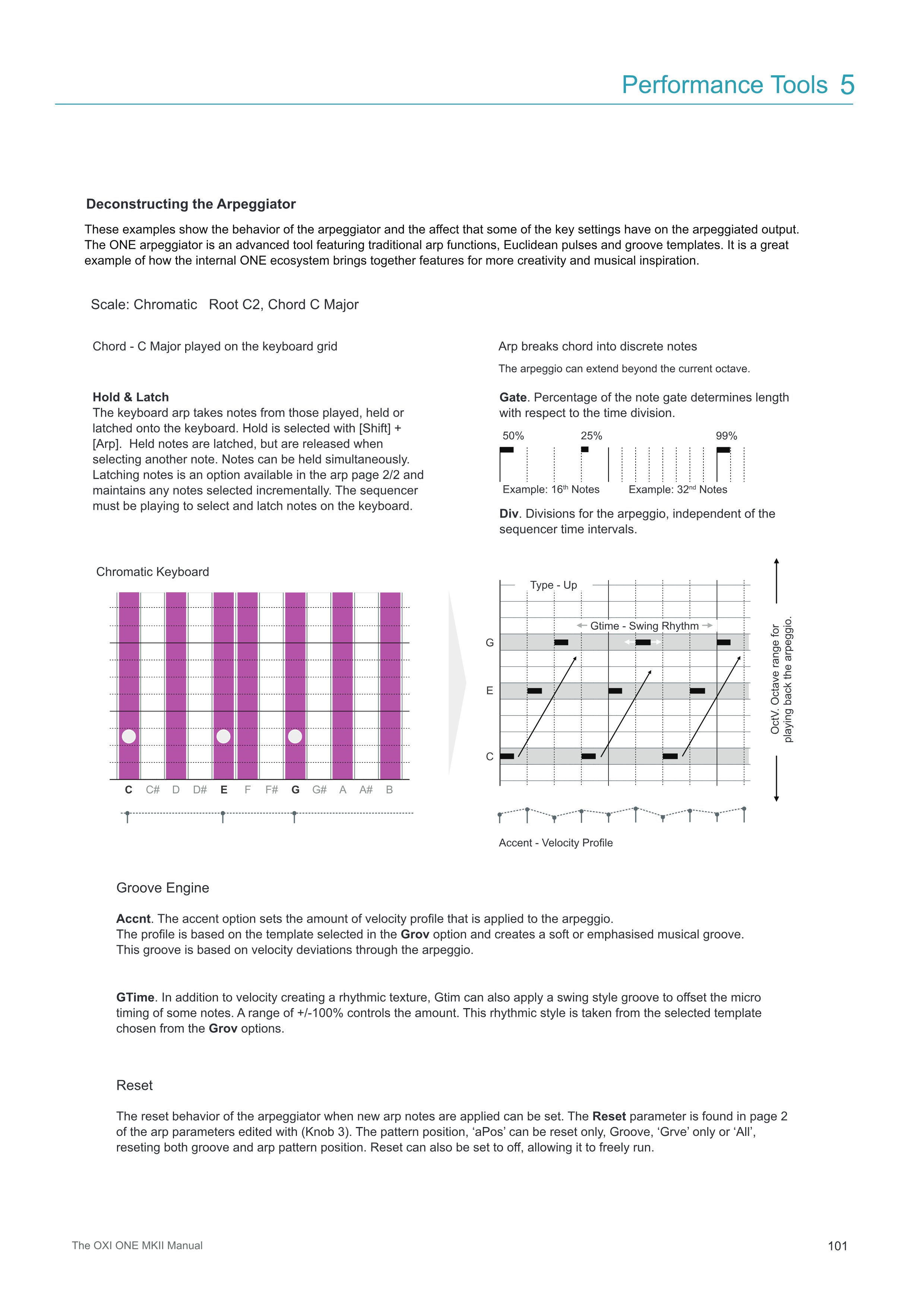新しいarp音符が適用されたときのarpeggiatorのリセット動作を設定できます。Resetパラメータは、arpパラメータのページ2にあり、(Knob 3)で編集されます。パターンポジション「aPos」のみをリセット、Groove「Grve」のみ、または「All」で両方のグルーブとarpパターンポジションをリセットできます。Resetはオフに設定することもでき、自由に実行できます。