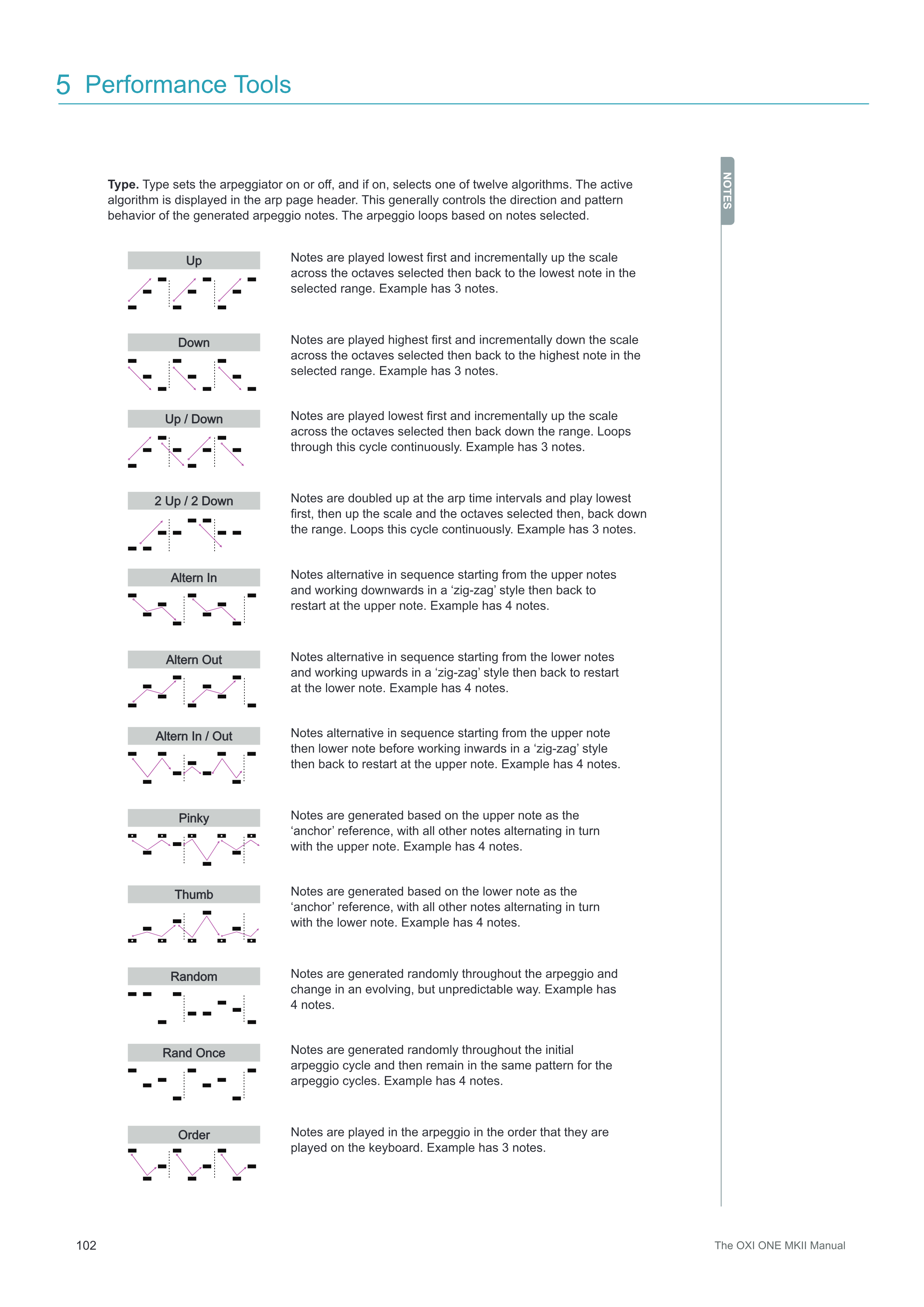 2 Up / 2 Down NOTESはarpタイムインターバルで2倍になり、最低音から始まり、スケールと選択されたオクターブを上昇し、その後範囲を下降します。このサイクルを継続的にループします。例では3つの音符があります。