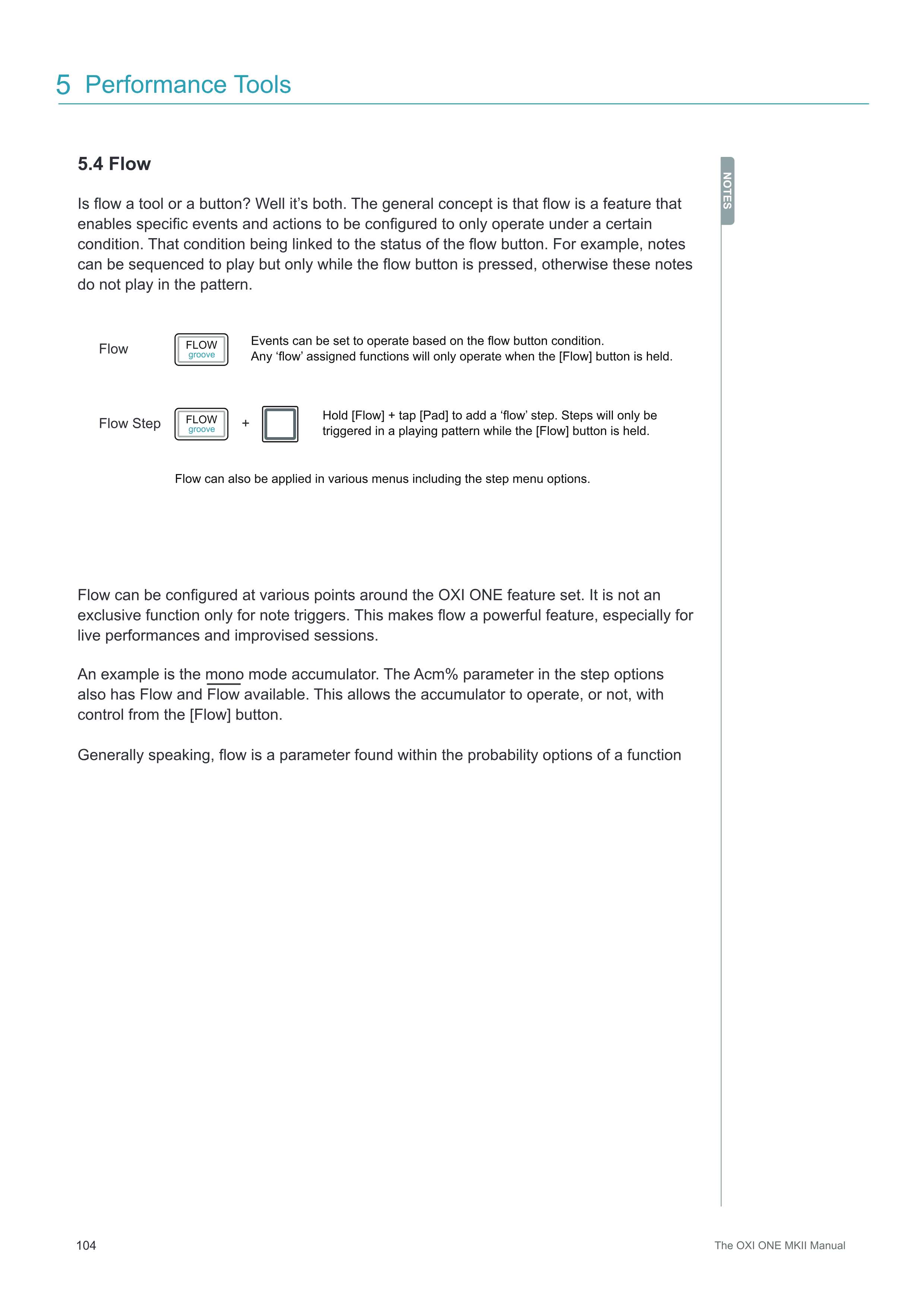FlowはOXI ONEの機能セット全体のさまざまな場所で設定できます。ノートトリガー専用の機能ではありません。これにより、flowは特にライブパフォーマンスや即興セッションにおいて強力な機能となります。