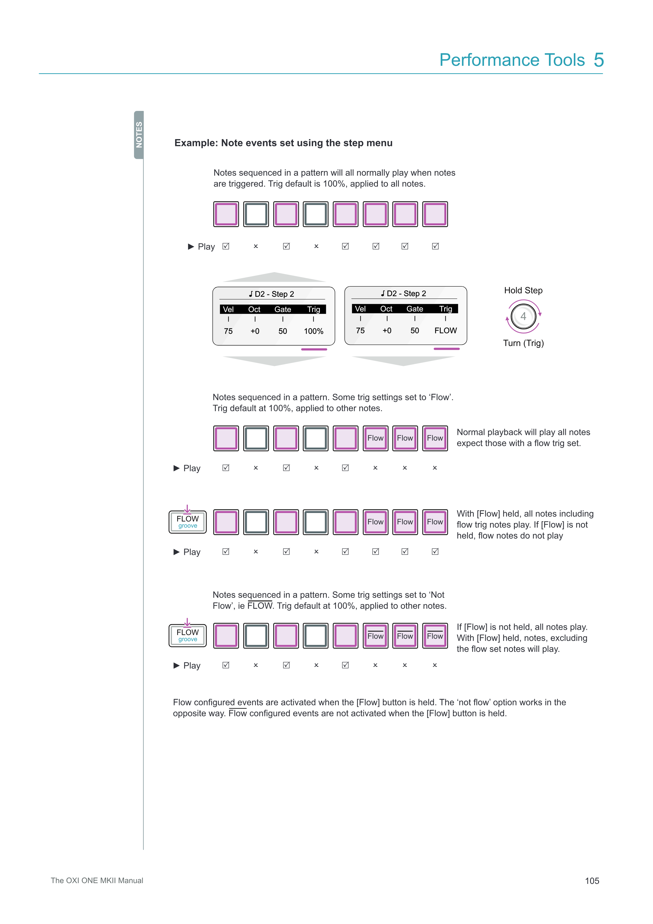 [Flow]を押したままにすると、Flow Trig Noteを含むすべてのNoteが再生されます。[Flow]を押していない場合、Flow Noteは再生されません。