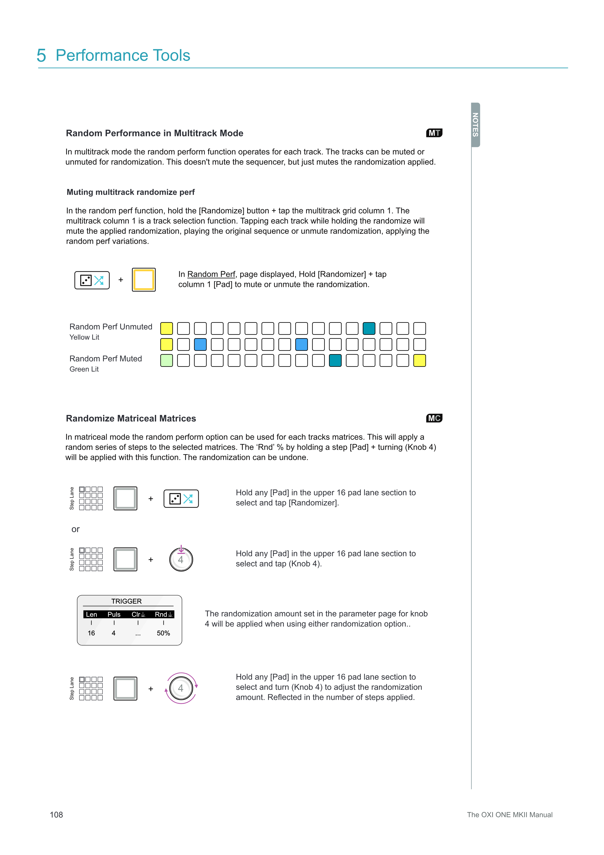 Matricealモードでは、random performオプションを各トラックのマトリクスに使用できます。これにより、選択したマトリクスにランダムな一連のステップが適用されます。ステップ[Pad]を押しながら(Knob 4)を回すことで設定される「Rnd」%がこの機能で適用されます。ランダム化は元に戻すことができます。