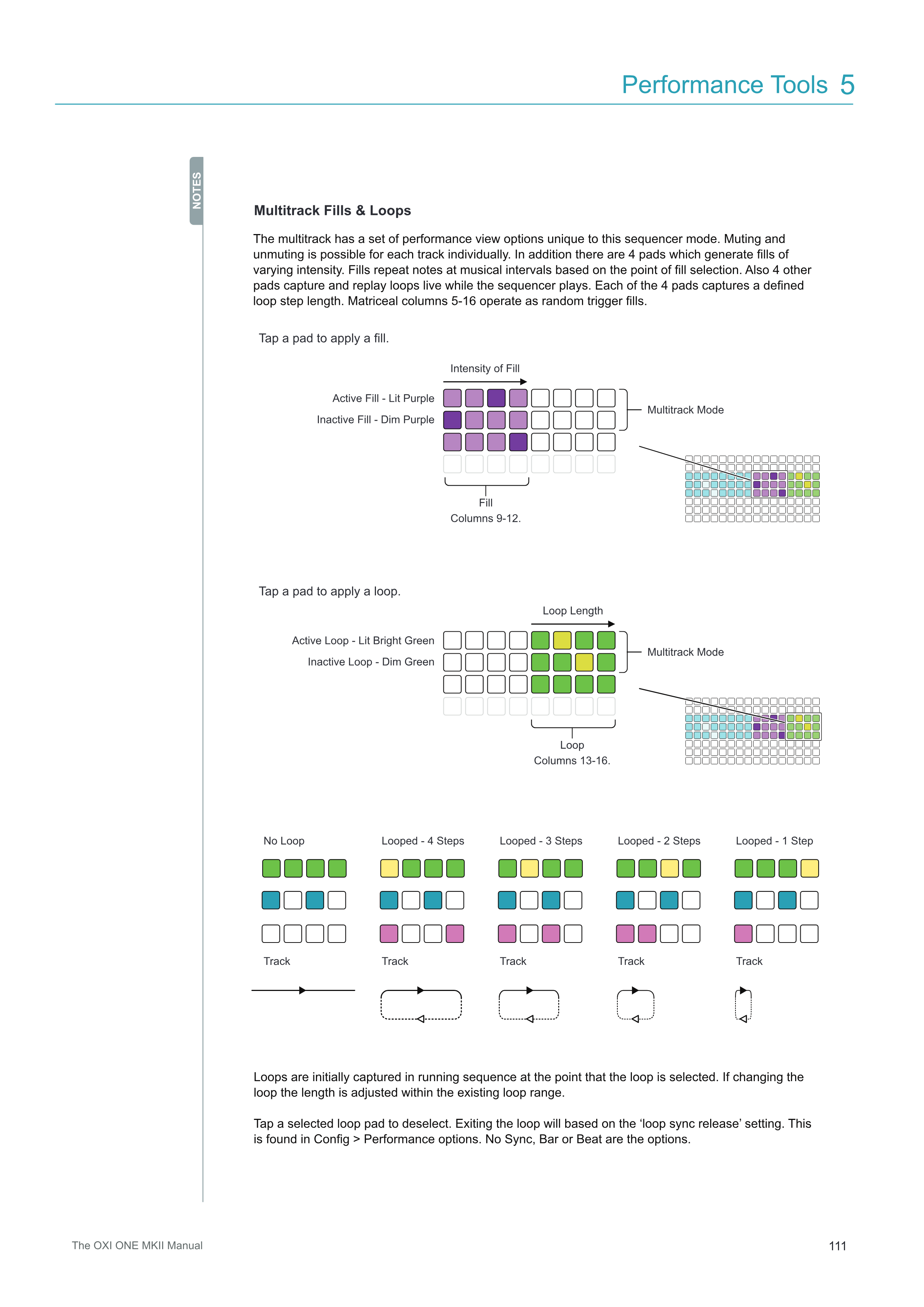 multitrackには、このsequencerモードに固有のperformance viewオプションのセットがあります。各トラックを個別にミュート、ミュート解除できます。さらに、様々な強度のfillを生成する4つのパッドがあります。Fillはfill選択のポイントに基づいて、音楽的な間隔でノートを繰り返します。また、他の4つのパッドは、sequencerの再生中にループをライブでキャプチャして再生します。4つのパッドそれぞれが、定義されたループステップの長さをキャプチャします。Matricealのcolumns 5-16はランダムトリガーfillとして動作します。