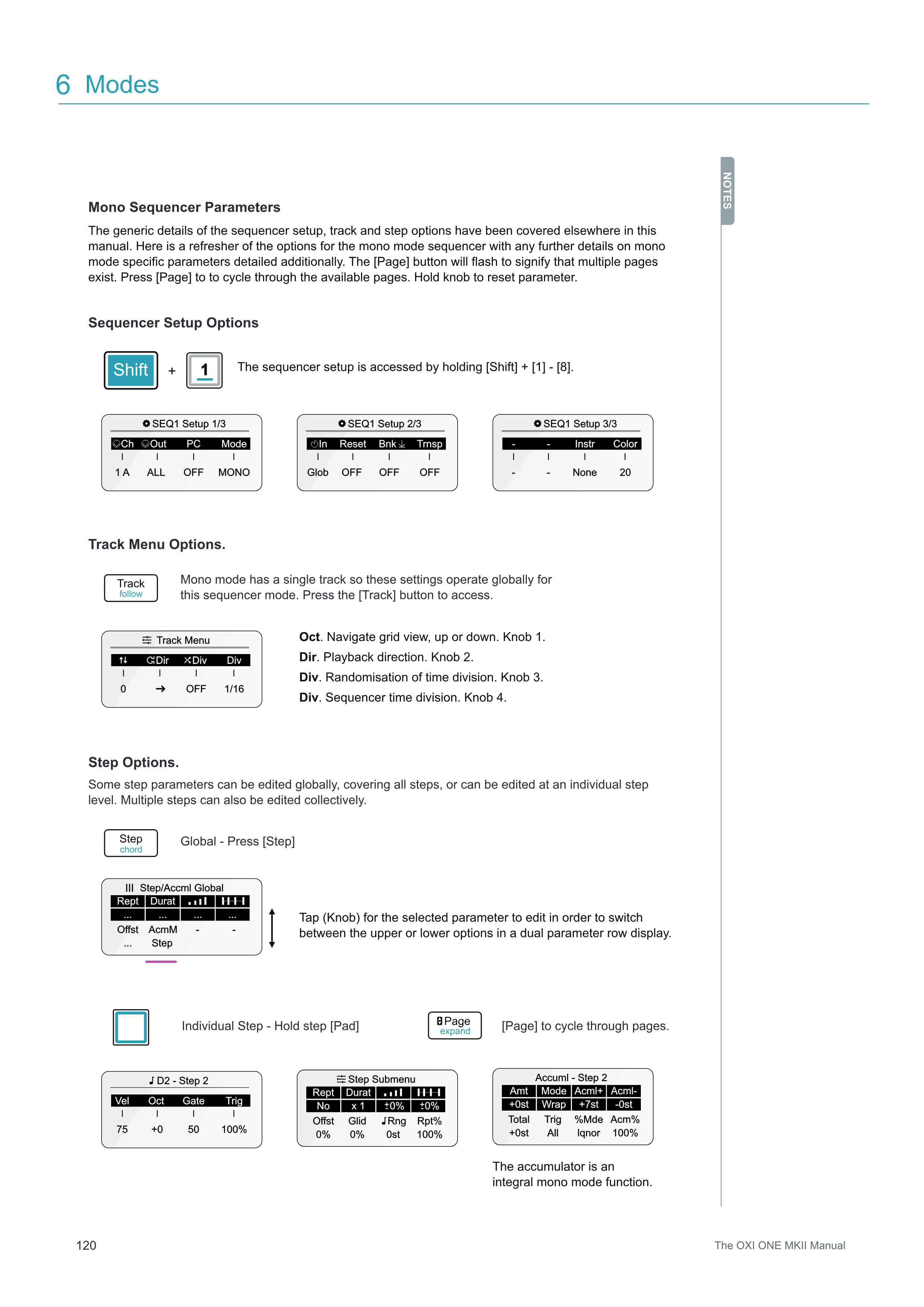 sequencer setup、track、step optionsの一般的な詳細については、このマニュアルの他の箇所で説明しています。ここでは、mono modeのsequencerのoptionsについての復習と、mono mode特有のパラメータの詳細を追加で説明します。[Page]ボタンが点滅している場合、複数のページが存在することを示しています。[Page]を押して利用可能なページを切り替えます。ノブを押したままにするとパラメータがリセットされます。