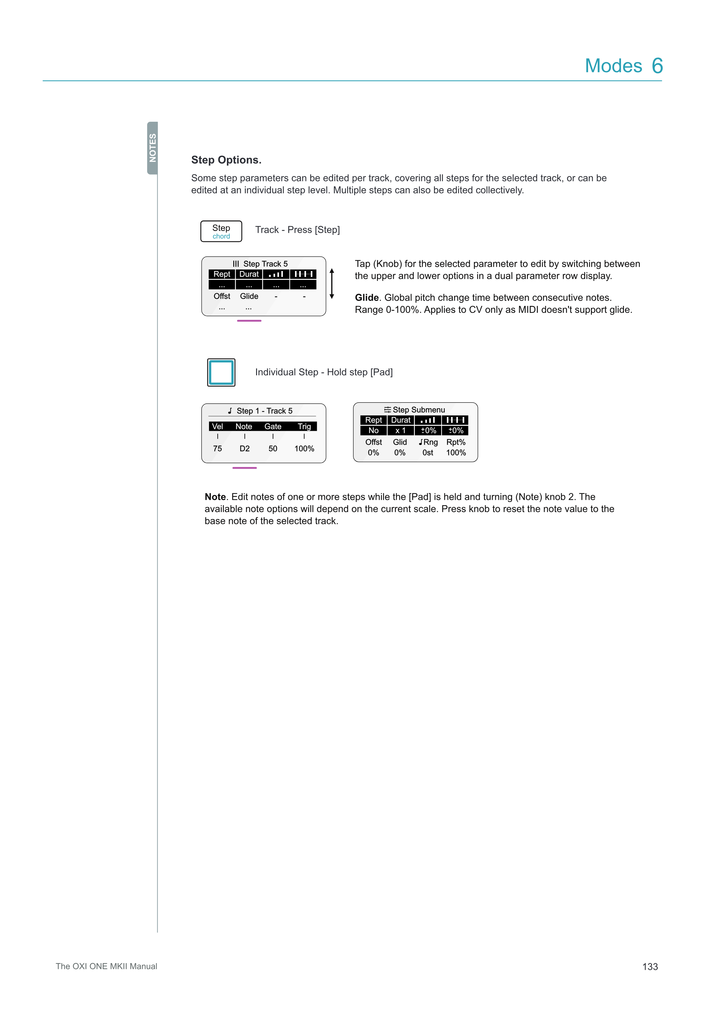 Note. [Pad]を押し続けながら(Note) knob 2を回すと、1つまたは複数のステップのノートを編集できます。使用可能なノートオプションは、現在のスケールによって異なります。knobを押すと、選択したトラックのベースノートにノート値がリセットされます。