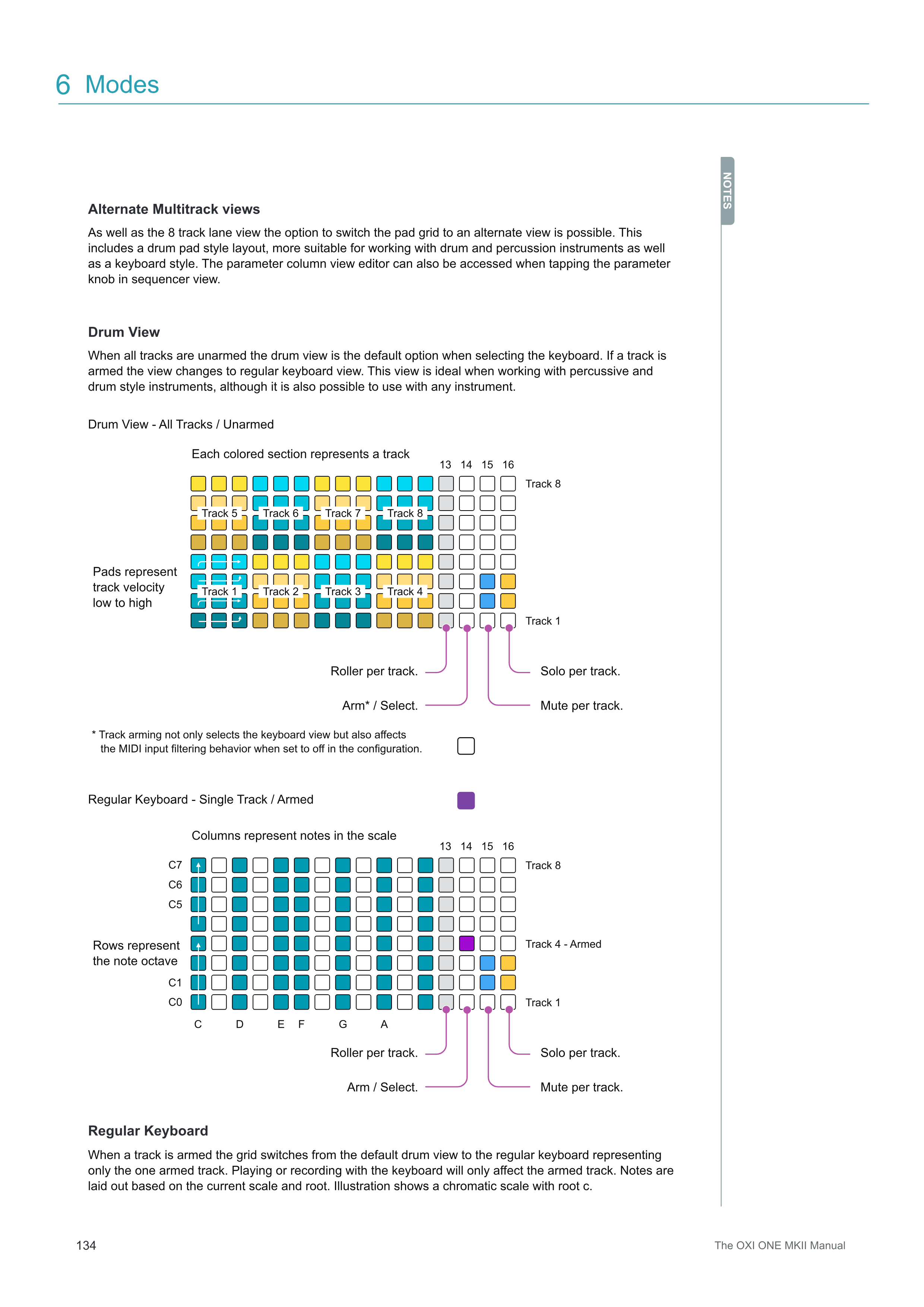 トラックがアームされると、グリッドはデフォルトのdrum viewから、1つのアームされたトラックのみを表すregular keyboardに切り替わります。keyboardで演奏または録音すると、アームされたトラックのみに影響します。音符は、現在のスケールとルートに基づいて配置されます。図はルートCのクロマチックスケールを示しています。