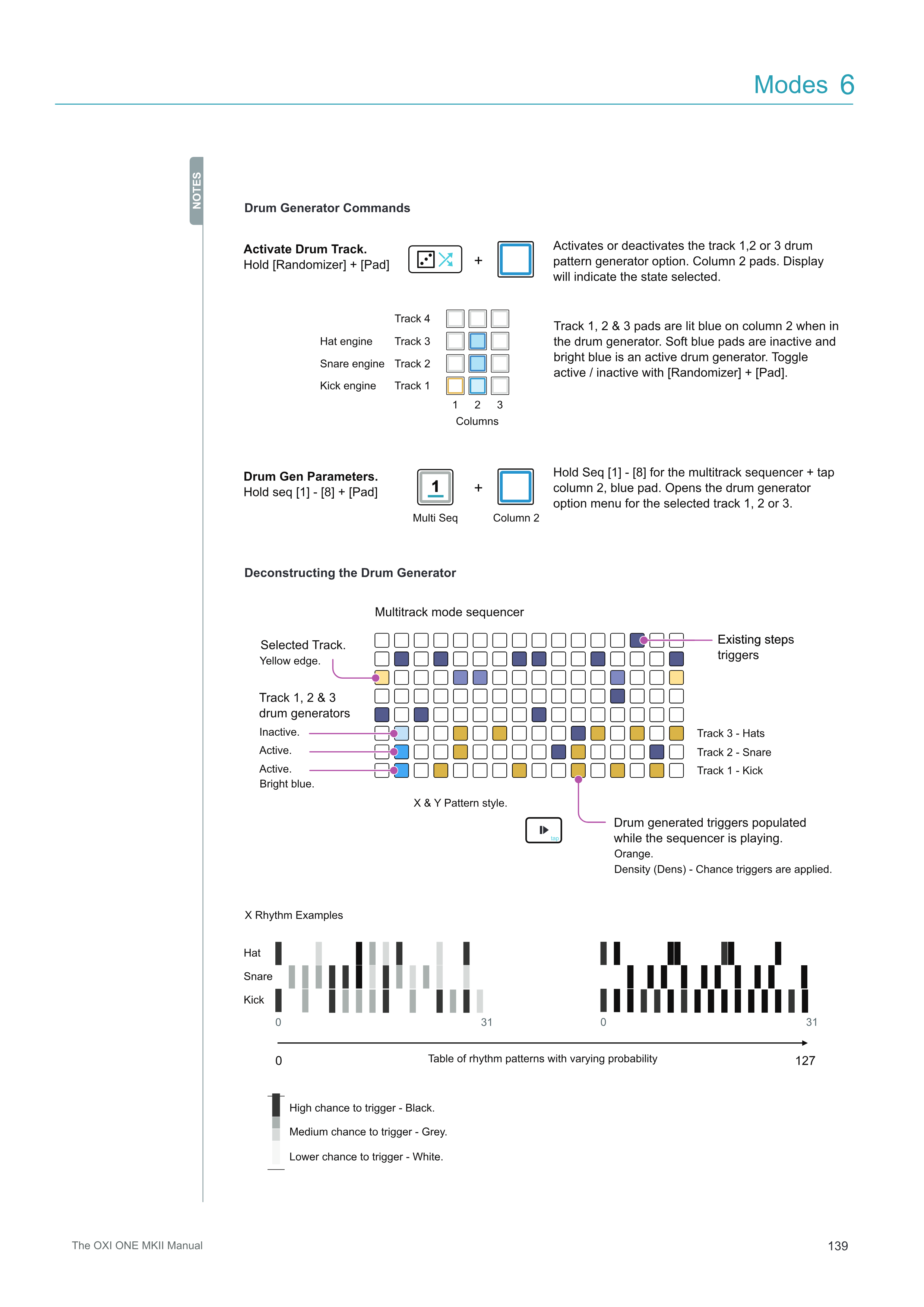 Track 1、2、3のpadは、drum generatorモードではカラム2で青く点灯します。ソフトブルーのpadは非アクティブで、ブライトブルーはアクティブなdrum generatorです。[Randomizer] + [Pad]でアクティブ/非アクティブを切り替えます。