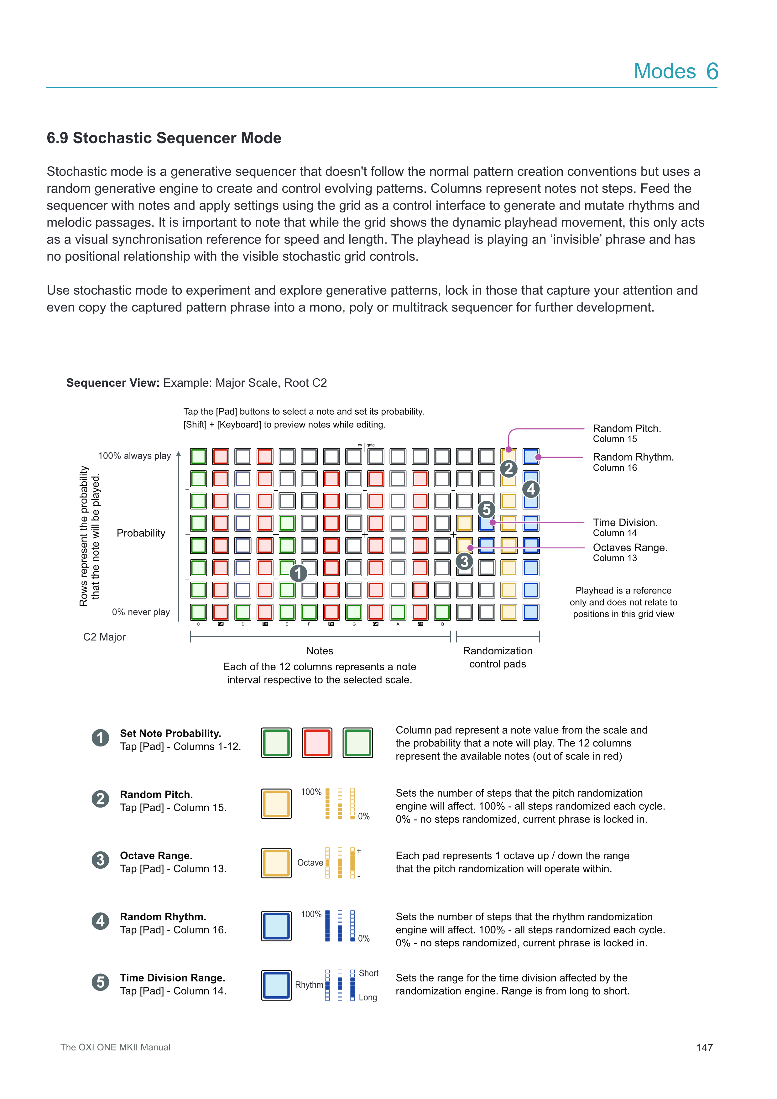 Stochasticモードは、通常のパターン作成規則に従わず、ランダムな生成エンジンを使用して進化するパターンを作成および制御する生成型sequencerです。列はステップではなく音符を表します。sequencerに音符を与え、グリッドをコントロールインターフェースとして使用して設定を適用し、リズムとメロディーのフレーズを生成および変化させます。重要な点として、グリッドは動的なプレイヘッドの動きを表示しますが、これは速度と長さの視覚的な同期参照としてのみ機能します。プレイヘッドは「見えない」フレーズを再生しており、表示されているstochasticグリッドコントロールとは位置的な関係はありません。