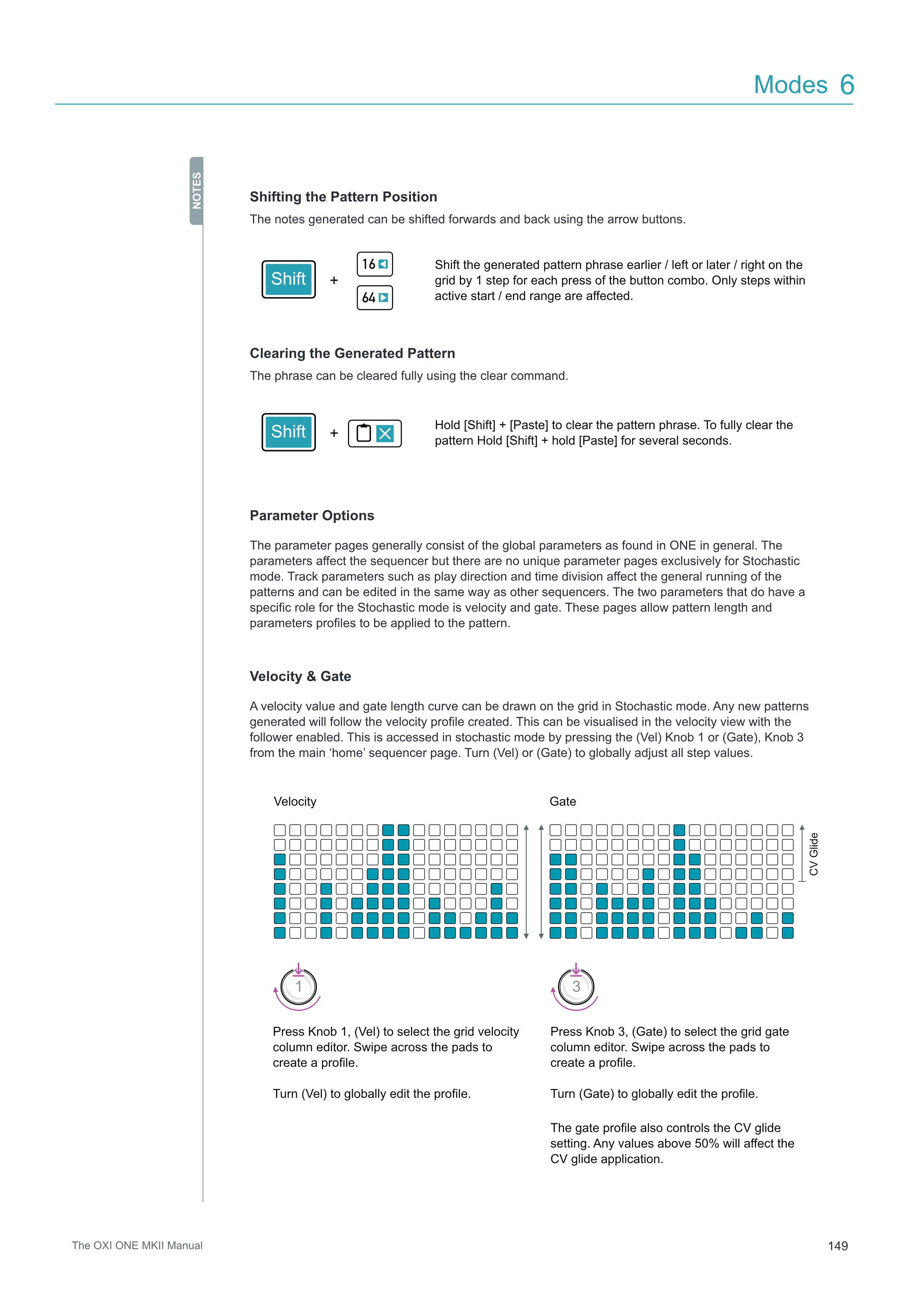 パラメータページは、一般的にONEで見られるグローバルパラメータで構成されています。これらのパラメータはsequencerに影響を与えますが、Stochasticモード専用の固有のパラメータページはありません。再生方向やtime divisionなどのトラックパラメータは、パターンの全体的な動作に影響し、他のsequencerと同じ方法で編集できます。Stochasticモードで特定の役割を持つ2つのパラメータは、velocityとgateです。これらのページでは、パターンの長さとパラメータプロファイルをパターンに適用できます。