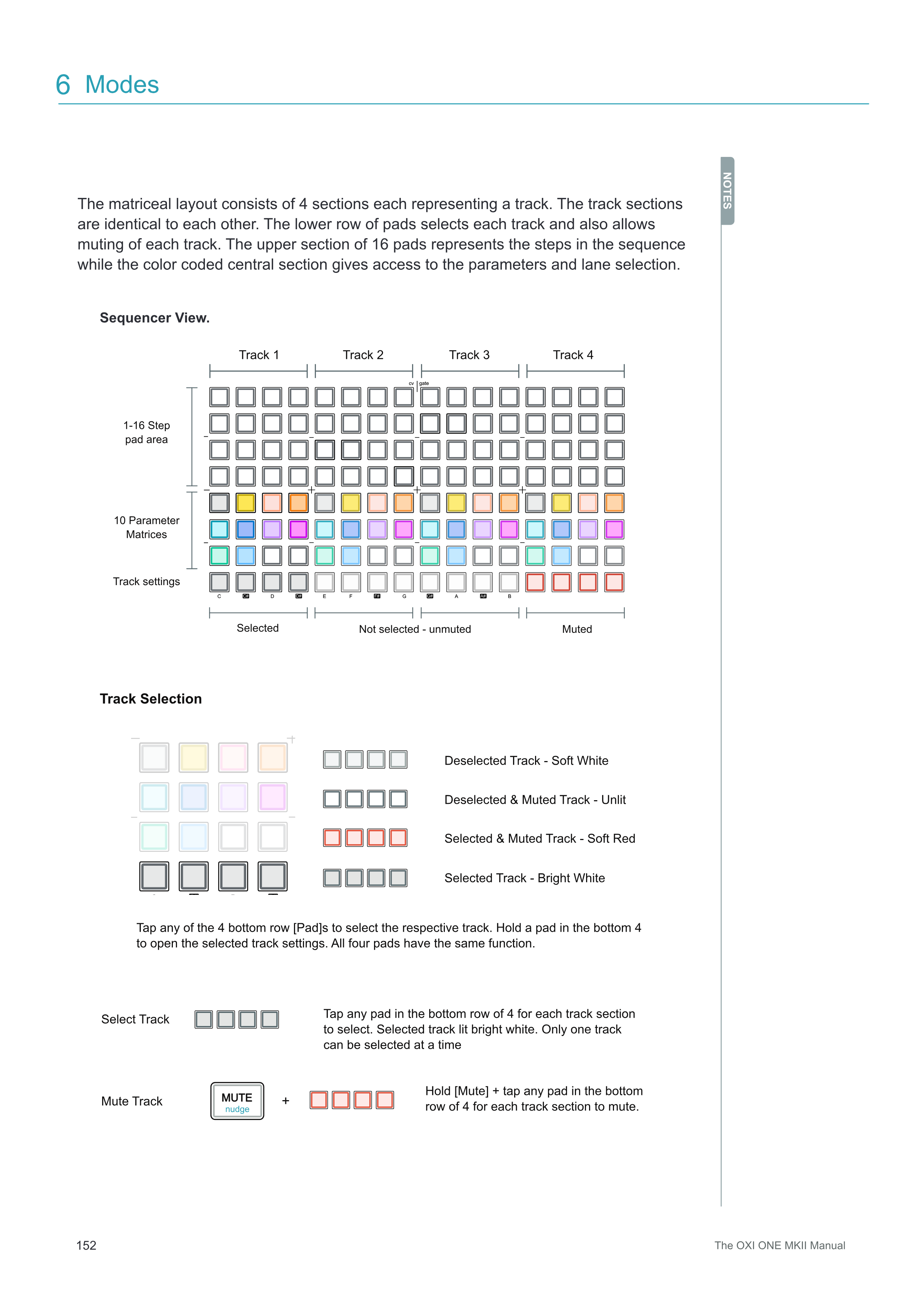 Select Track 各トラックセクションの下段4つのいずれかのパッドをタップして選択します。選択されたトラックは明るい白で点灯します。一度に選択できるトラックは1つだけです。