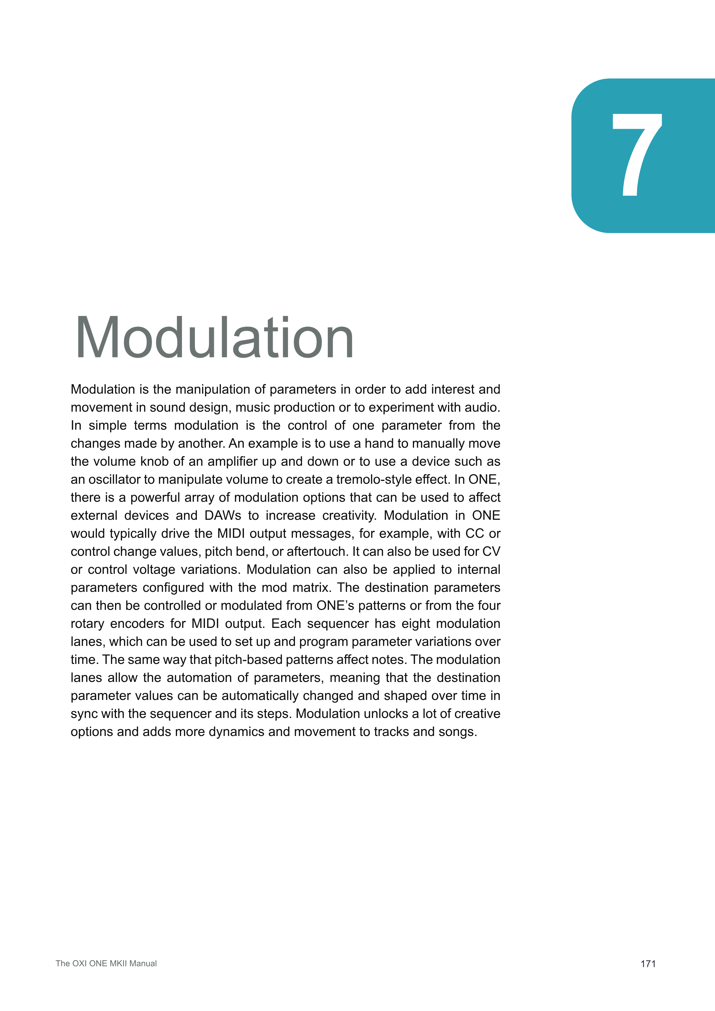 簡単に言えば、modulationとは、あるパラメータを別のパラメータの変化によって制御することです。例えば、手でアンプのボリュームノブを上下に動かしたり、オシレーターのようなデバイスを使ってボリュームを操作しトレモロ風の効果を作り出すことが挙げられます。ONEには、外部デバイスやDAWに影響を与え、創造性を高めるために使用できる強力なmodulationオプションが数多く用意されています。ONEにおけるmodulationは、通常MIDIの出力メッセージを駆動します。例えば、CCまたはコントロールチェンジ値、ピッチベンド、アフタータッチなどです。CVまたはコントロール電圧の変化にも使用できます。Modulationは、modマトリックスで設定された内部パラメータにも適用できます。そして、目的のパラメータをONEのパターンから、またはMIDI出力用の4つのロータリーエンコーダーから制御またはmodulateすることができます。各sequencerには8つのmodulationレーンがあり、時間経過に伴うパラメータの変化を設定およびプログラムするために使用できます。ピッチベースのパターンがノートに影響を与えるのと同じ方法です。Modulationレーンを使用すると、パラメータの自動化が可能になります。つまり、目的のパラメータ値を、sequencerとそのステップに同期して、時間の経過とともに自動的に変更し、形作ることができます。Modulationは、多くの創造的なオプションを解放し、トラックや曲により多くのダイナミクスと動きを加えます。